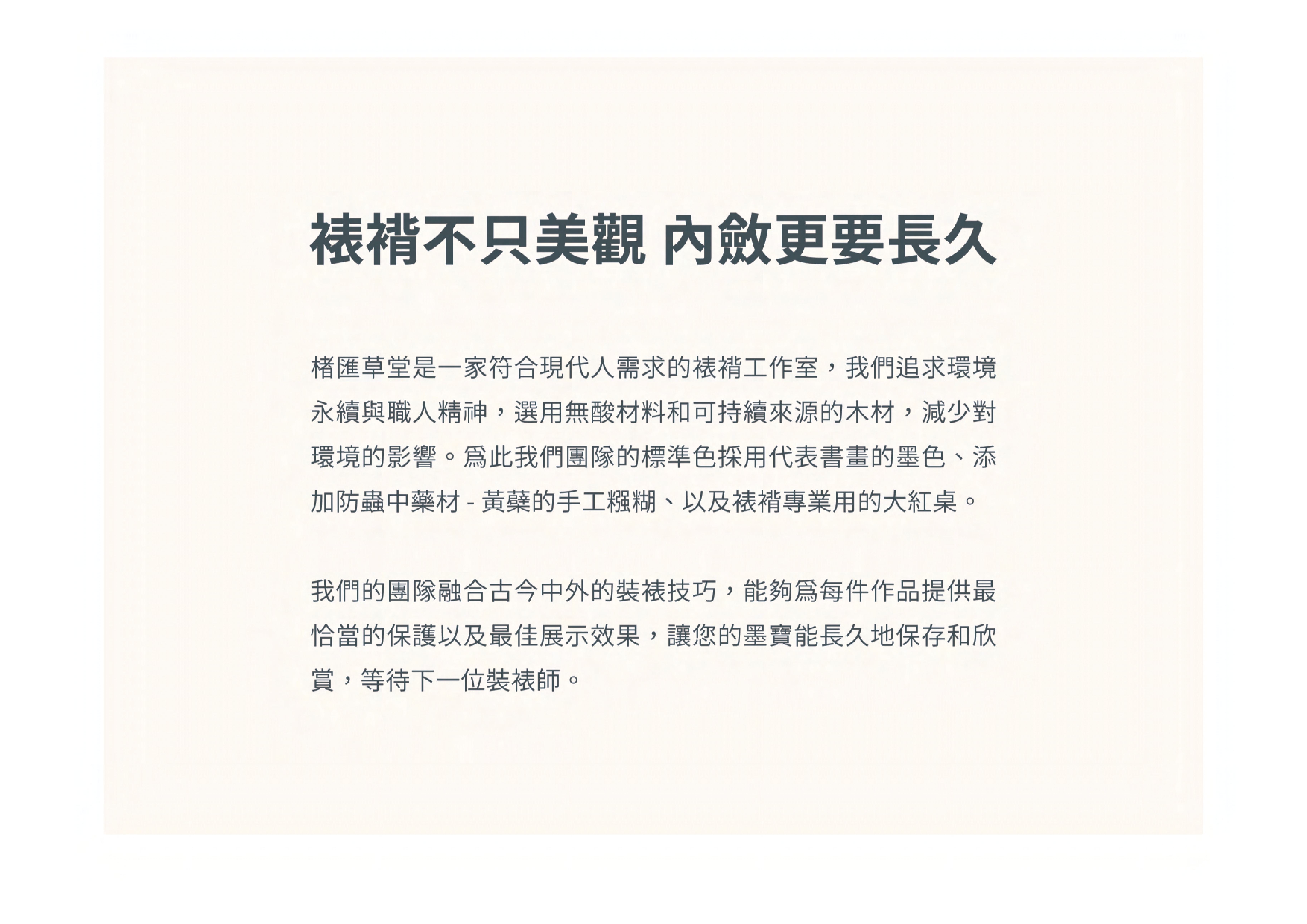 楮匯草堂是一家符合現代人需求的裱褙工作室,我們追求環境永續與職人精神,選用無酸材料和可持續來源的木材,減少對環境的影響。為此我們團隊的標準色採用代表書畫的墨色、添加防蟲中藥材 - 黃蘗的手工糨糊、以及裱褙專業用的大紅桌。 我們的團隊融合古今中外的裝裱技巧,能夠為每件作品提供最恰當的保護以及最佳展示效果,讓您的墨寶能長久地保存和欣賞,靜待下一位裱褙師到來,再次賦予墨寶新生。