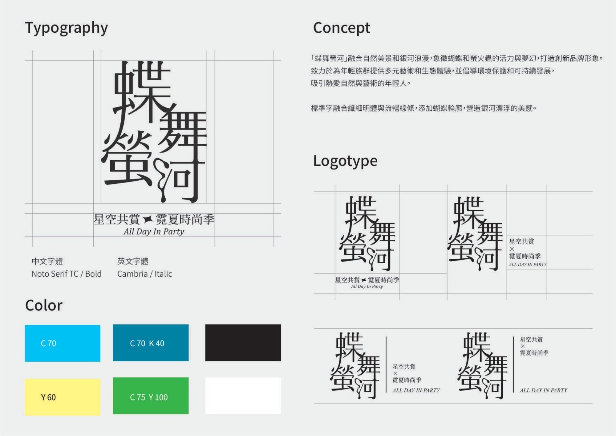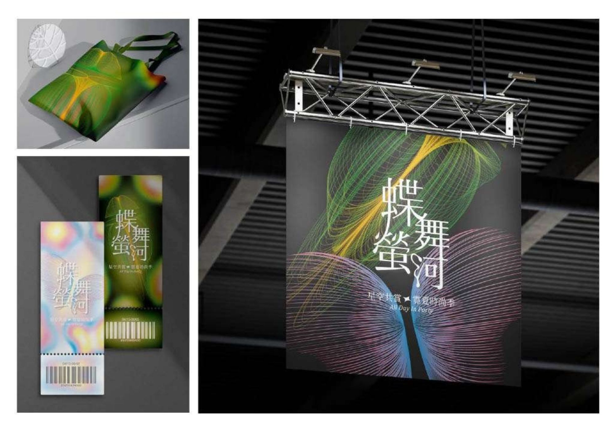 「大坑蝶螢嘉年華」結合自然美景與生態保護,透過重新設計品牌形象「蝶舞螢河」融合自然與銀河浪漫,象徵蝴蝶和螢火蟲的活力與夢幻,提供多元藝術和生態體驗,倡導環保與可持續發展,吸引熱愛自然與藝術的年輕人。 「蝶舞螢河」結合了永續、環保、藝術及時尚元素,整體風格以未來感、宇宙銀河、霓虹和絢爛為主。活動包括走秀開場、市集商家和DIY體驗,核心理念是「取之自然、用於自然」。活動願景是為年輕一代打造全新的生態多元體驗,欣賞大自然展覽,實現「藝術、永續」的概念。 "ALL DAY IN PARTY" combines sustainability, environmental protection, art and fashion elements, and the overall style is futuristic, cosmic galaxy, neon and gorgeous. The event included a catwalk opening, market vendors and a DIY experience, with the core idea of taking from nature and using nature. The vision of the event is to create a new ecological and diversified experience for the younger generation, appreciate the nature exhibition, and realize the concept of "art and sustainability".
