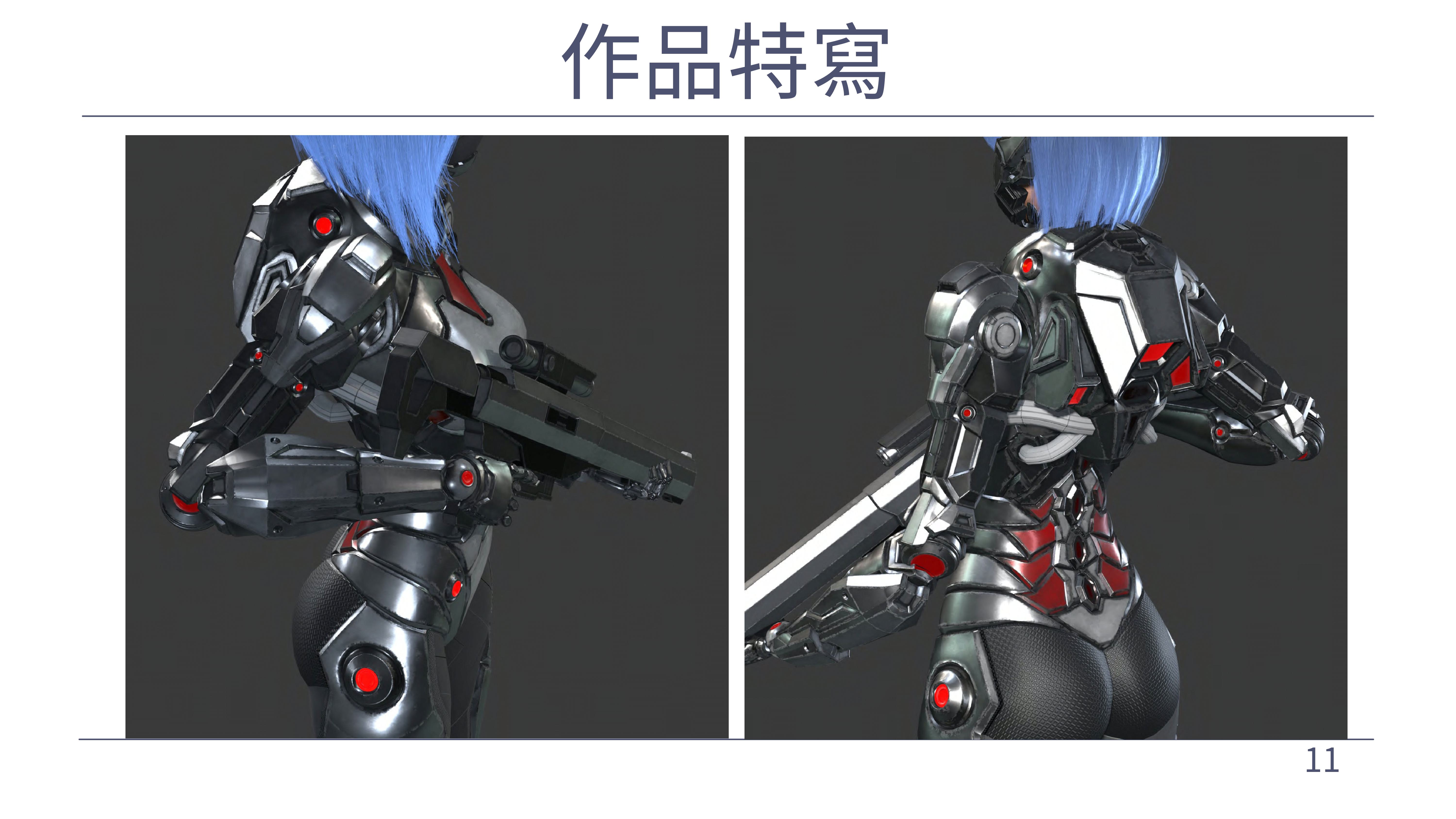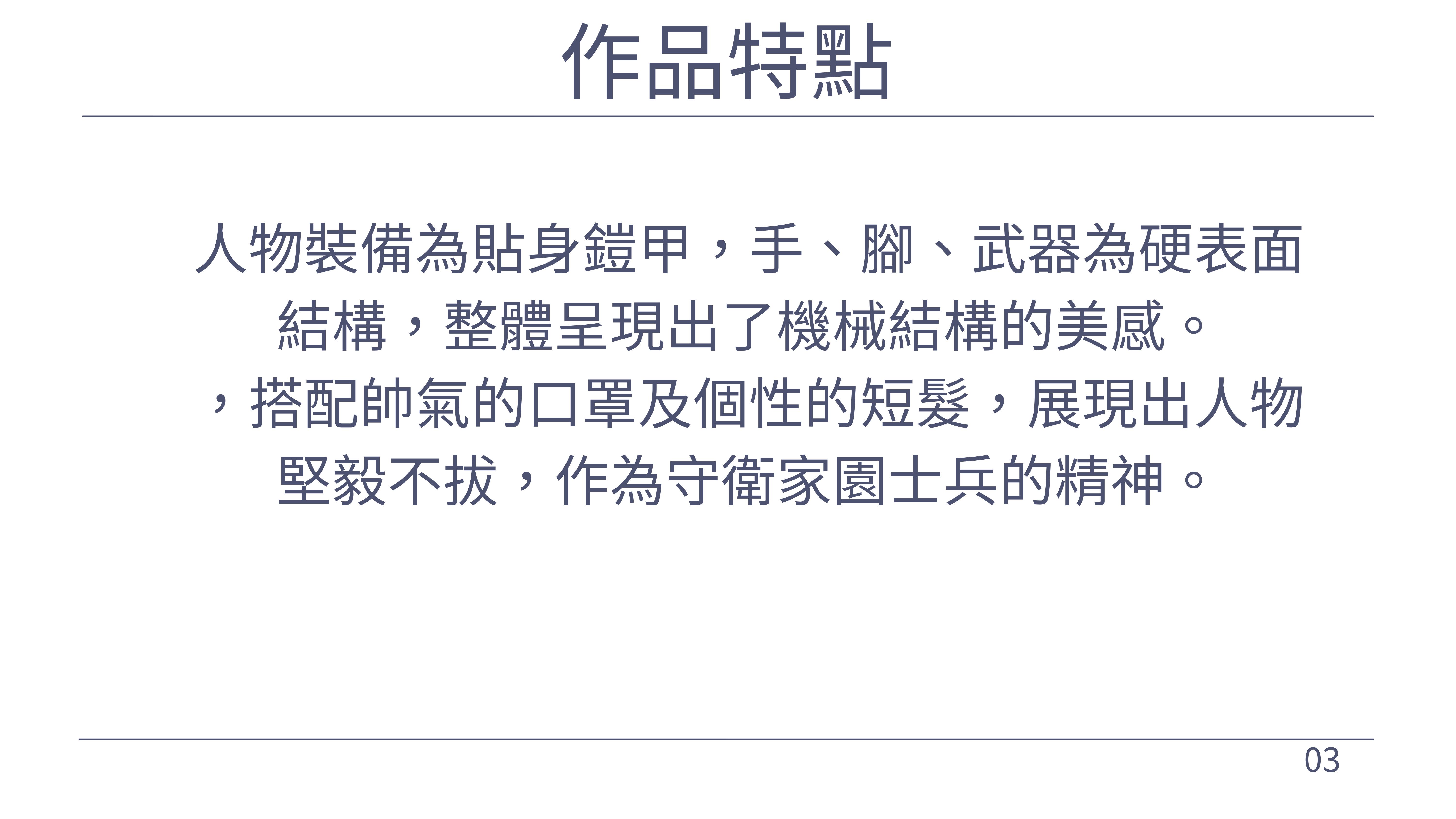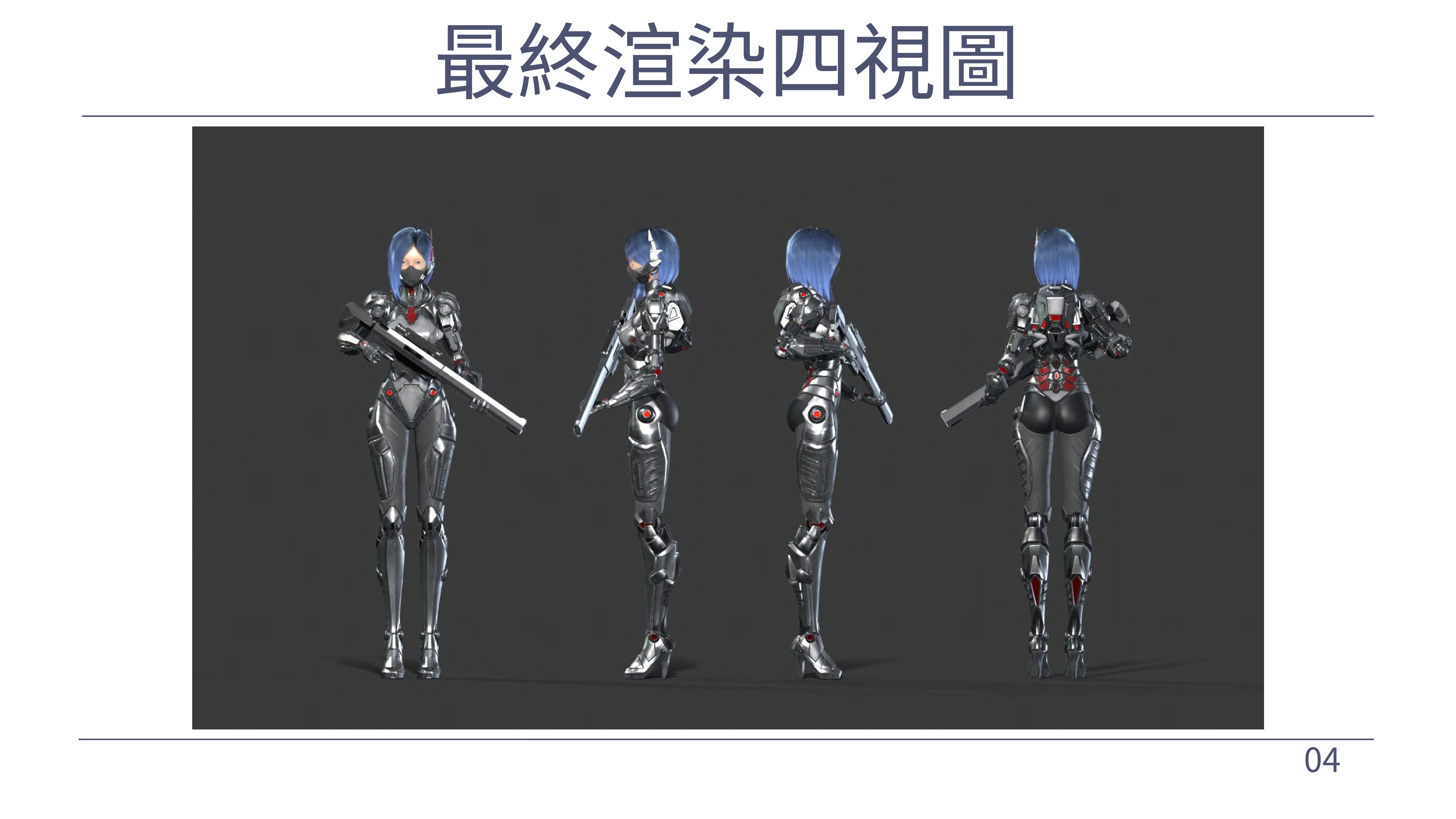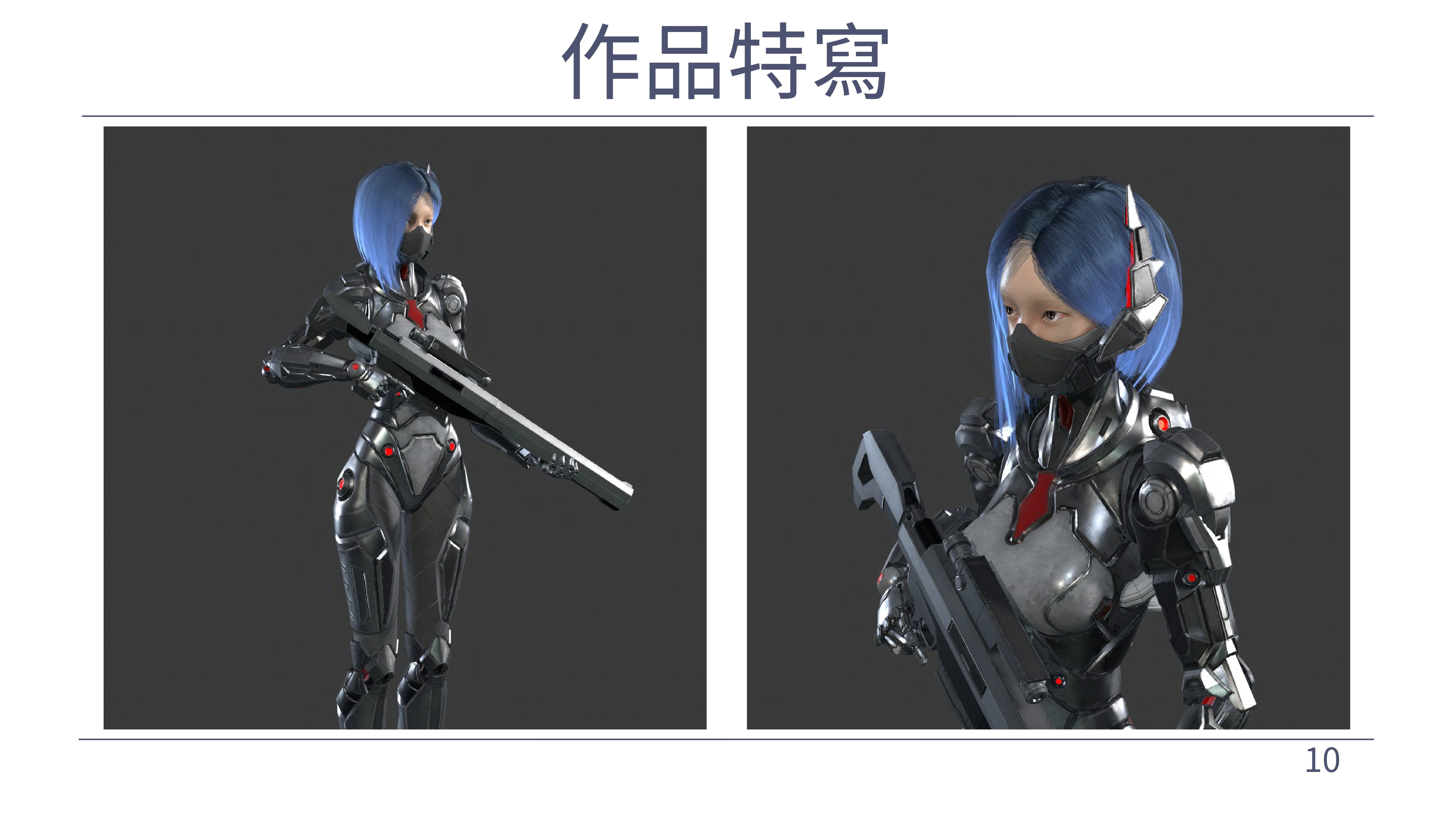 設計理念: 硬表面人物、裝備總是充滿了魅力,我也被深深吸引,因此設計了一個機械女兵。 作品特點: 人物裝備為貼身鎧甲,手、腳、武器為硬表面製作,整體呈現出了機械結構的美感。 ,搭配帥氣的口罩及個性的短髮,展現出人物堅毅不拔的精神。