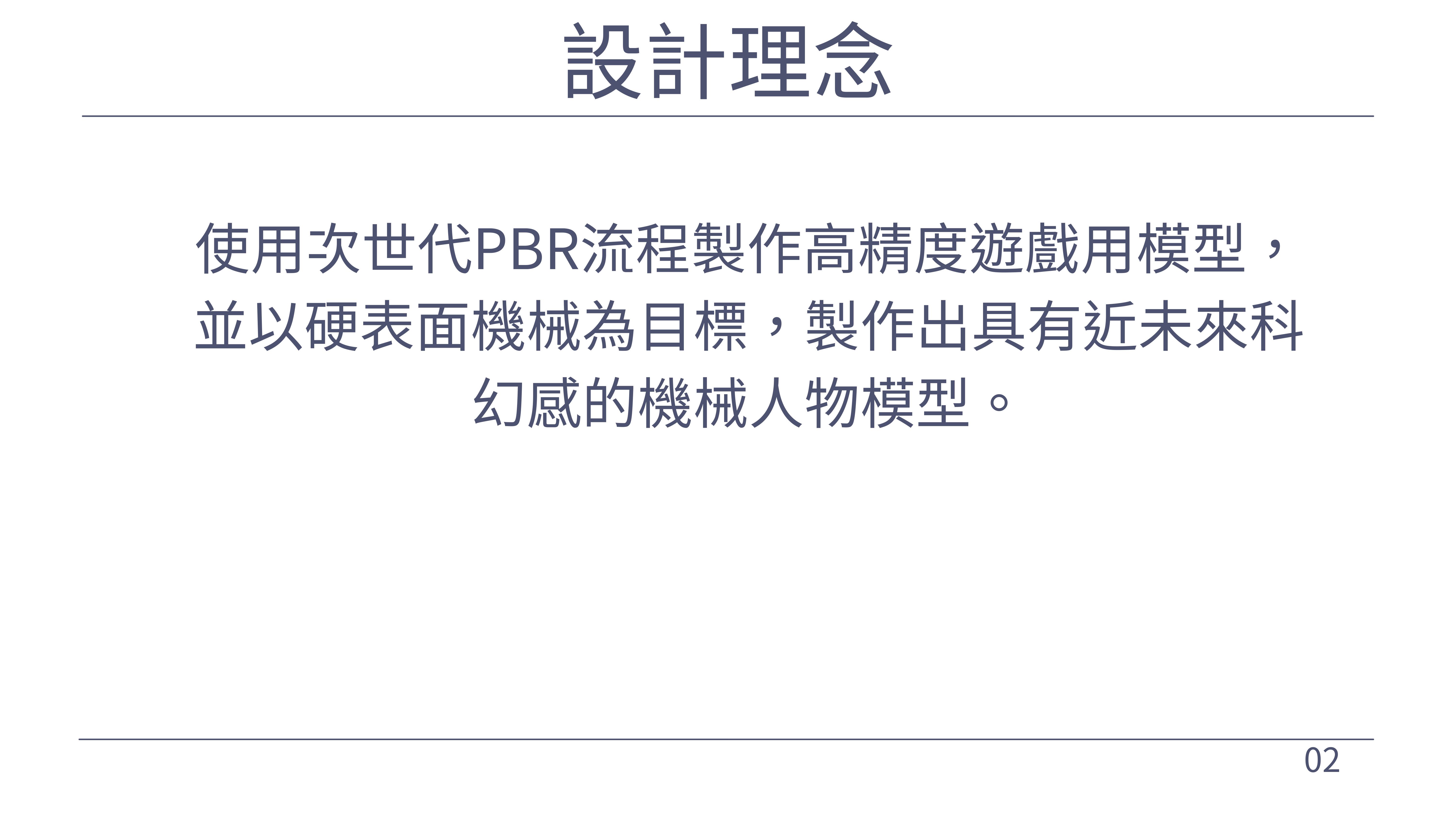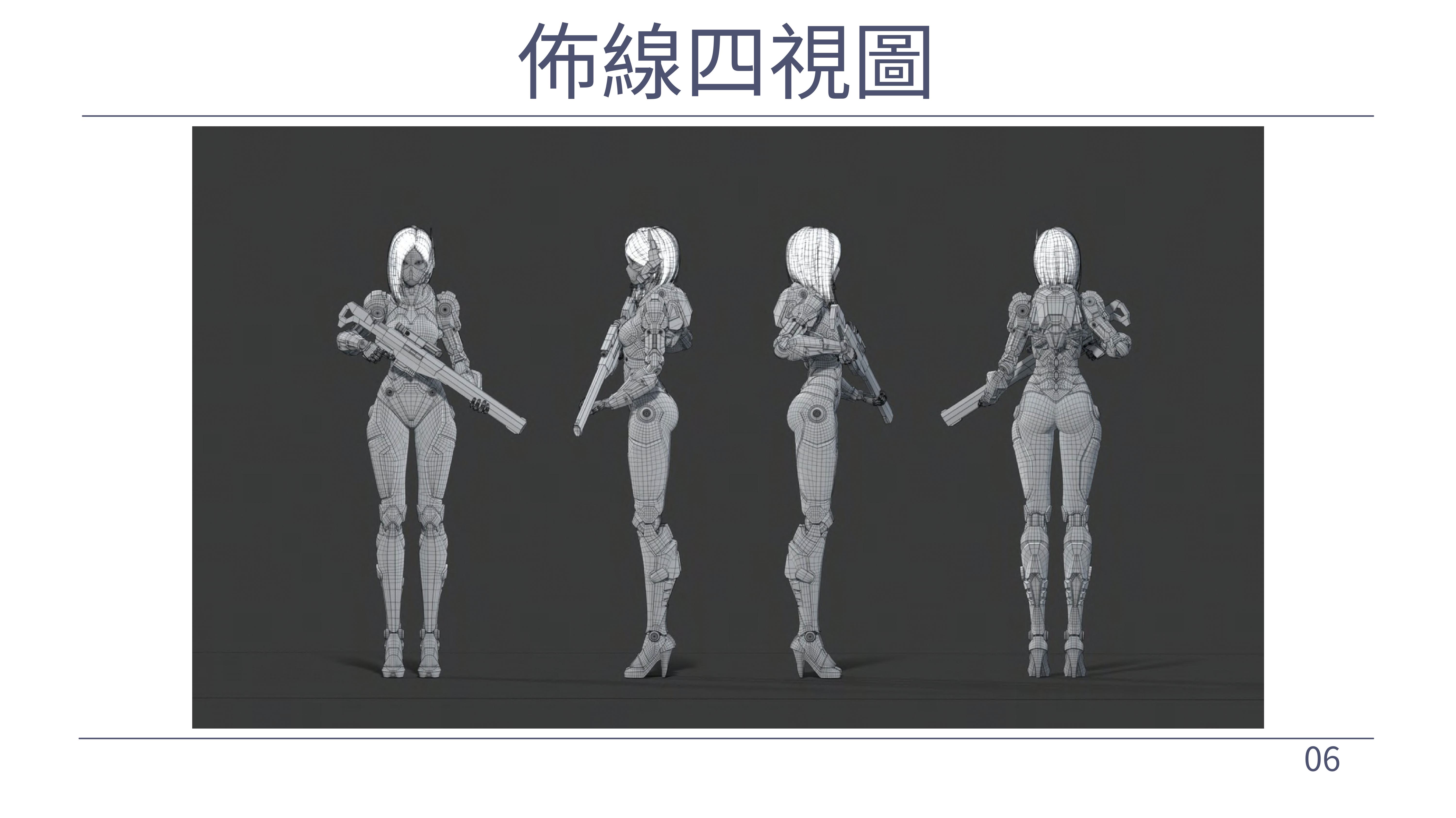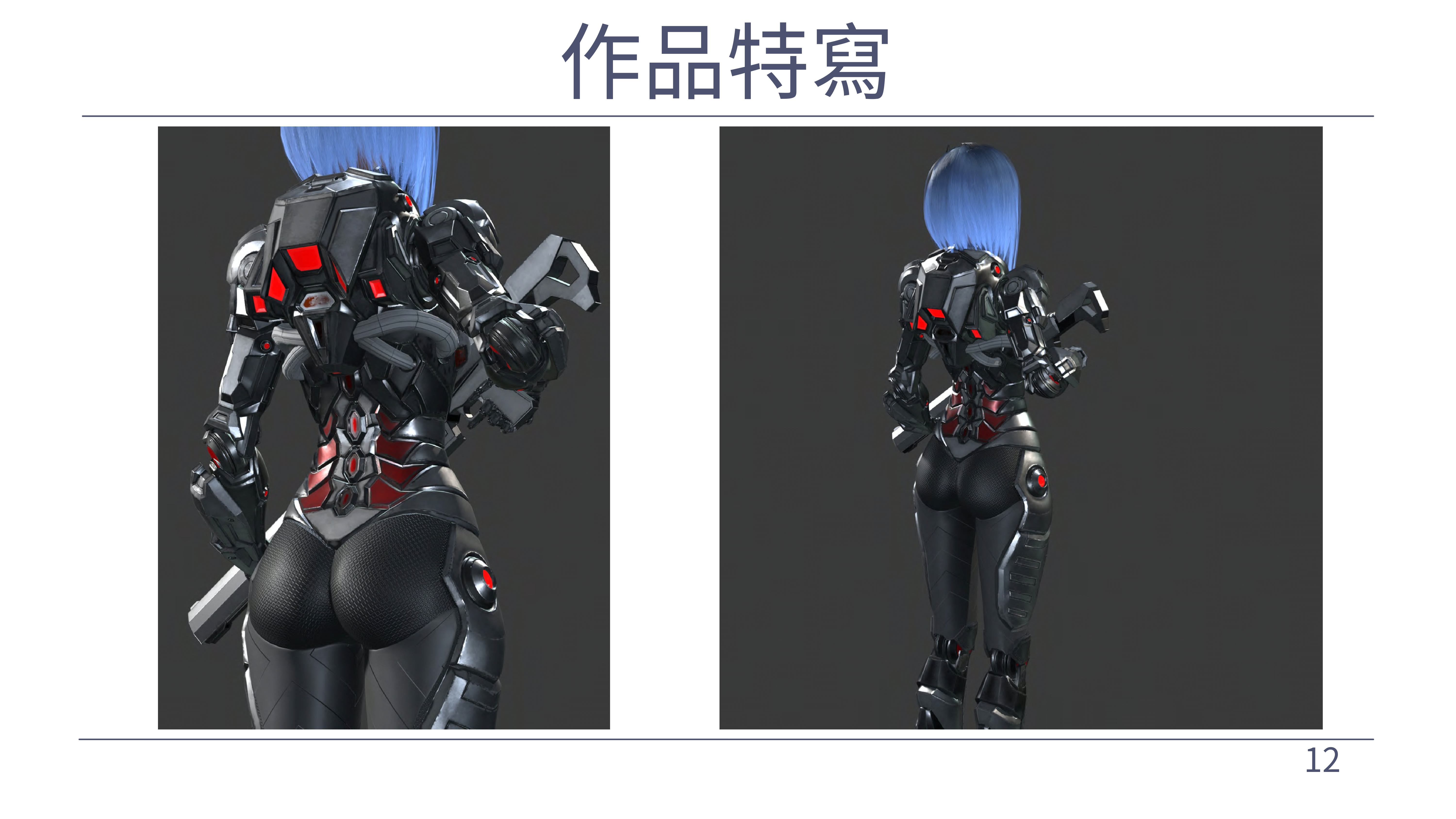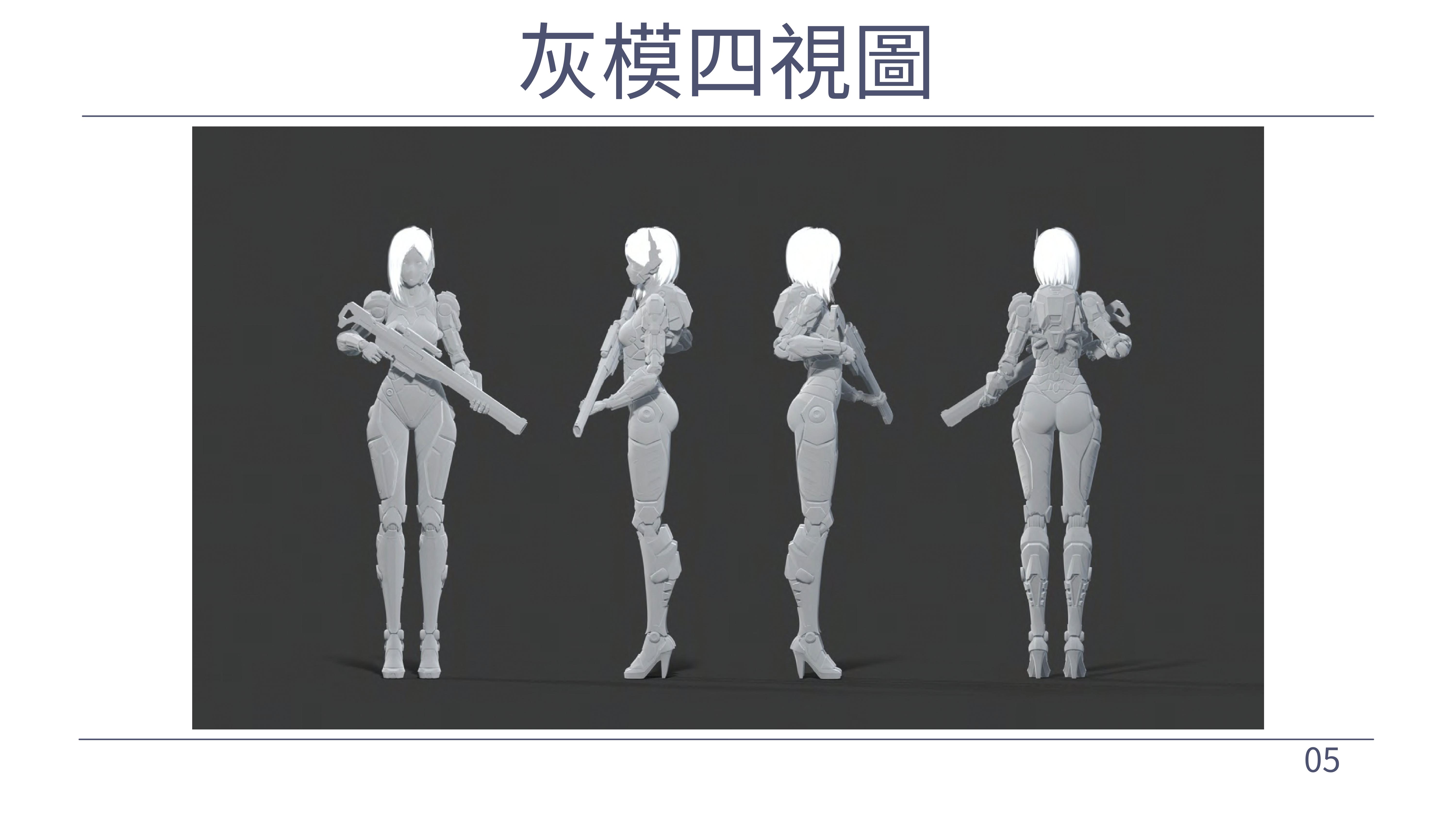 設計理念: 硬表面人物、裝備總是充滿了魅力,我也被深深吸引,因此設計了一個機械女兵。 作品特點: 人物裝備為貼身鎧甲,手、腳、武器為硬表面製作,整體呈現出了機械結構的美感。 ,搭配帥氣的口罩及個性的短髮,展現出人物堅毅不拔的精神。