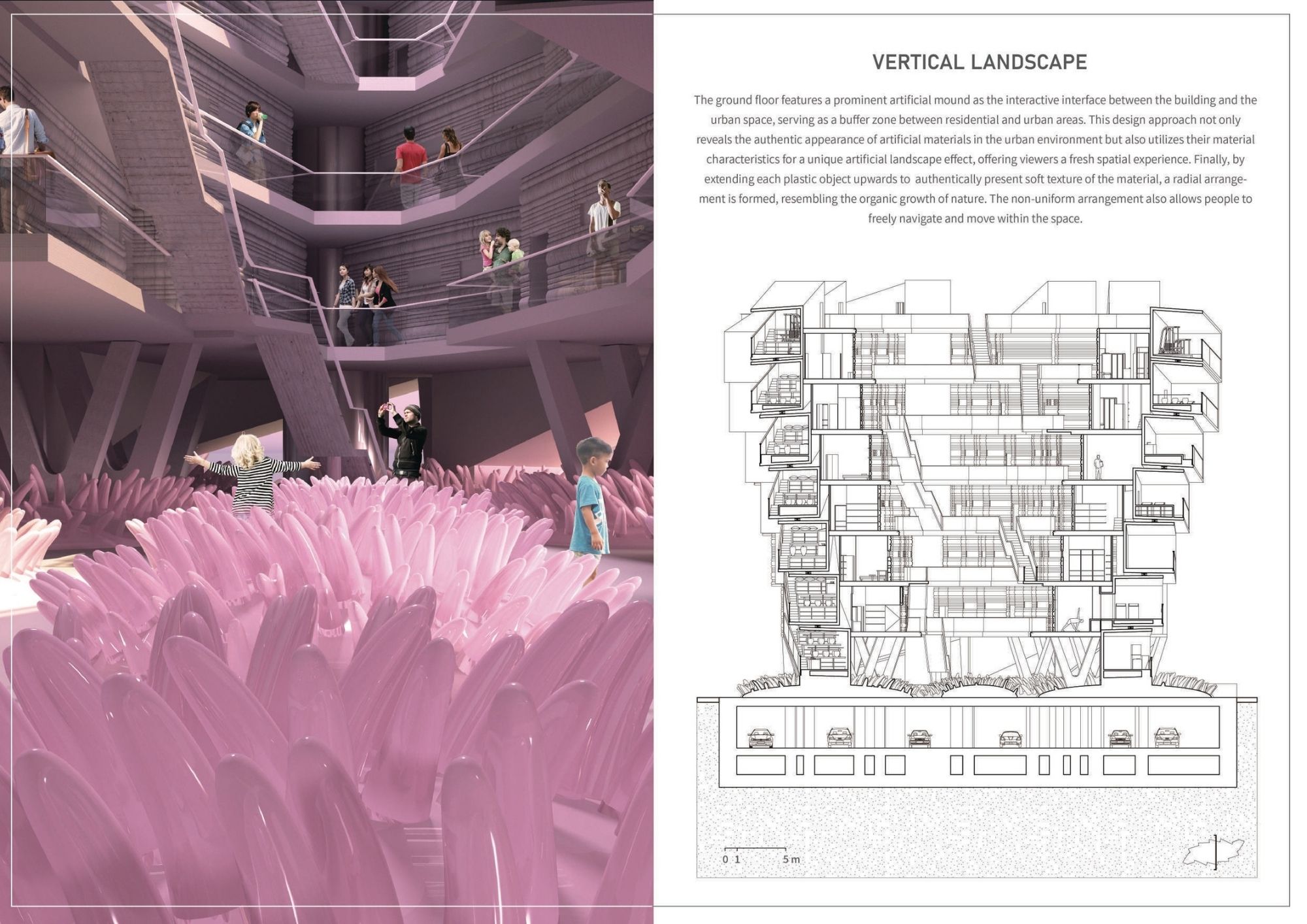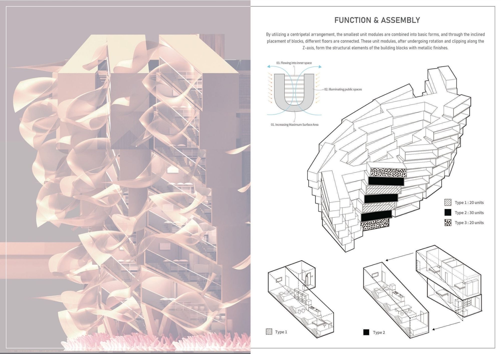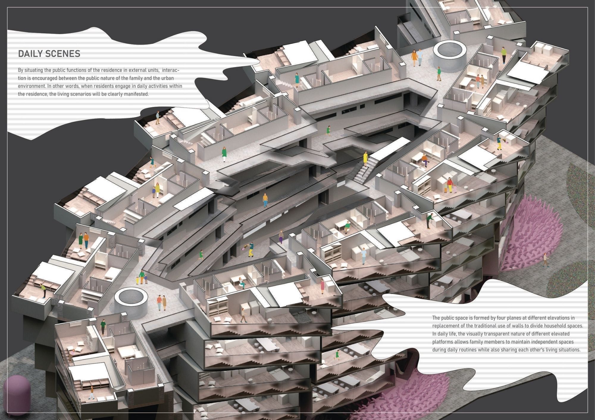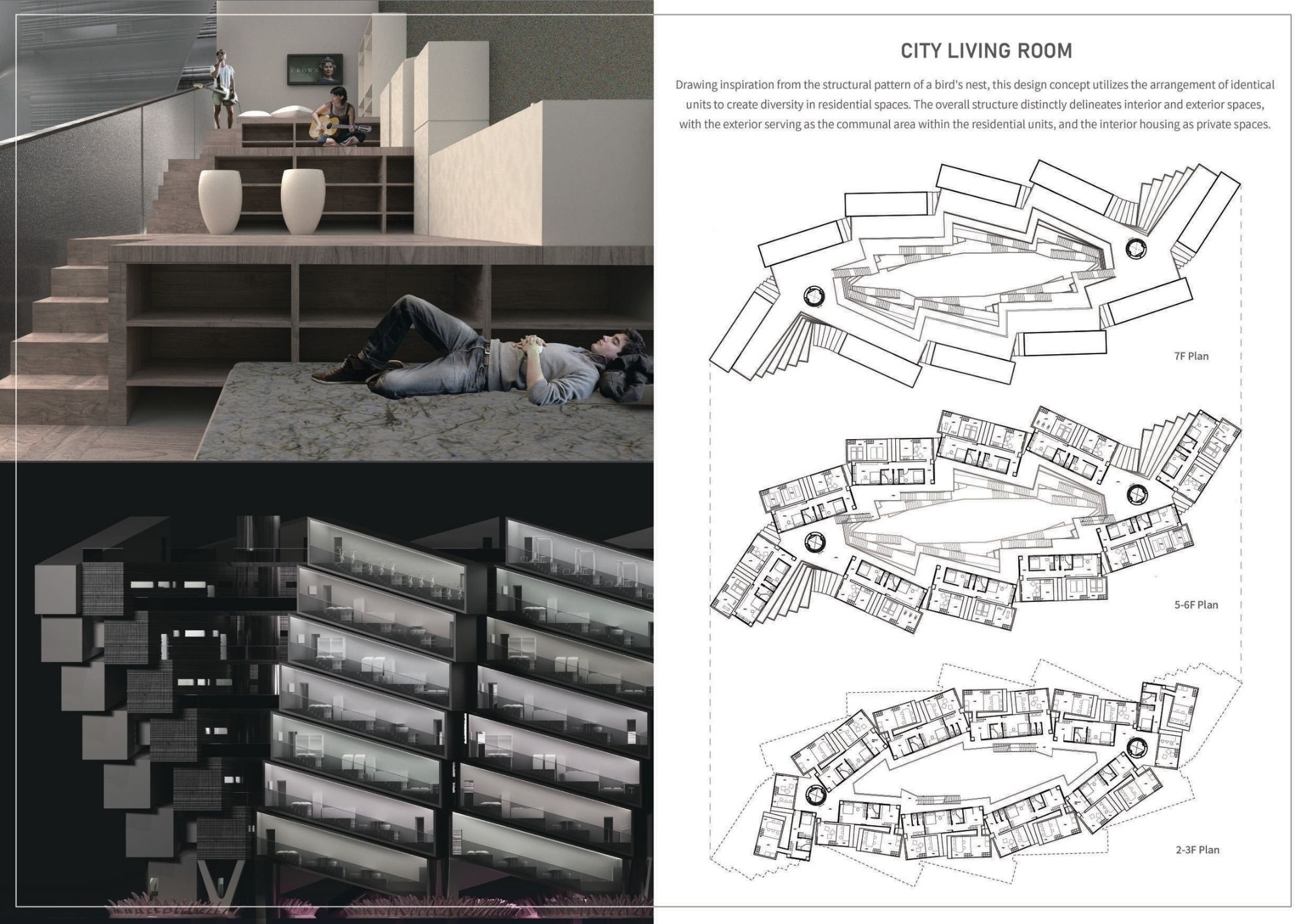 太空巢作為都市中的生活集合,透過多層高程的客廳平台來打開你我的日常,重新搭建起人與人的情感連結。整體機能,以三⼗個三房兩廳單元和⼆⼗個⼀房⼀廳單元來配置集合住宅,並在該住宅體的底層和頂層安排商業空間。物理環境上,將每個住宅單元透過切分成最小的空間單元,創造出最大的表面積,讓所有的居住空間都能夠最大化的接觸到陽光與空氣。最後以這些最⼩單元的傾斜排列,形成具有連續內外的巢狀空間,讓外部配置住宅中的公共空間,而內側配置私密的起居空間,達到公共與私密空間的平衡。