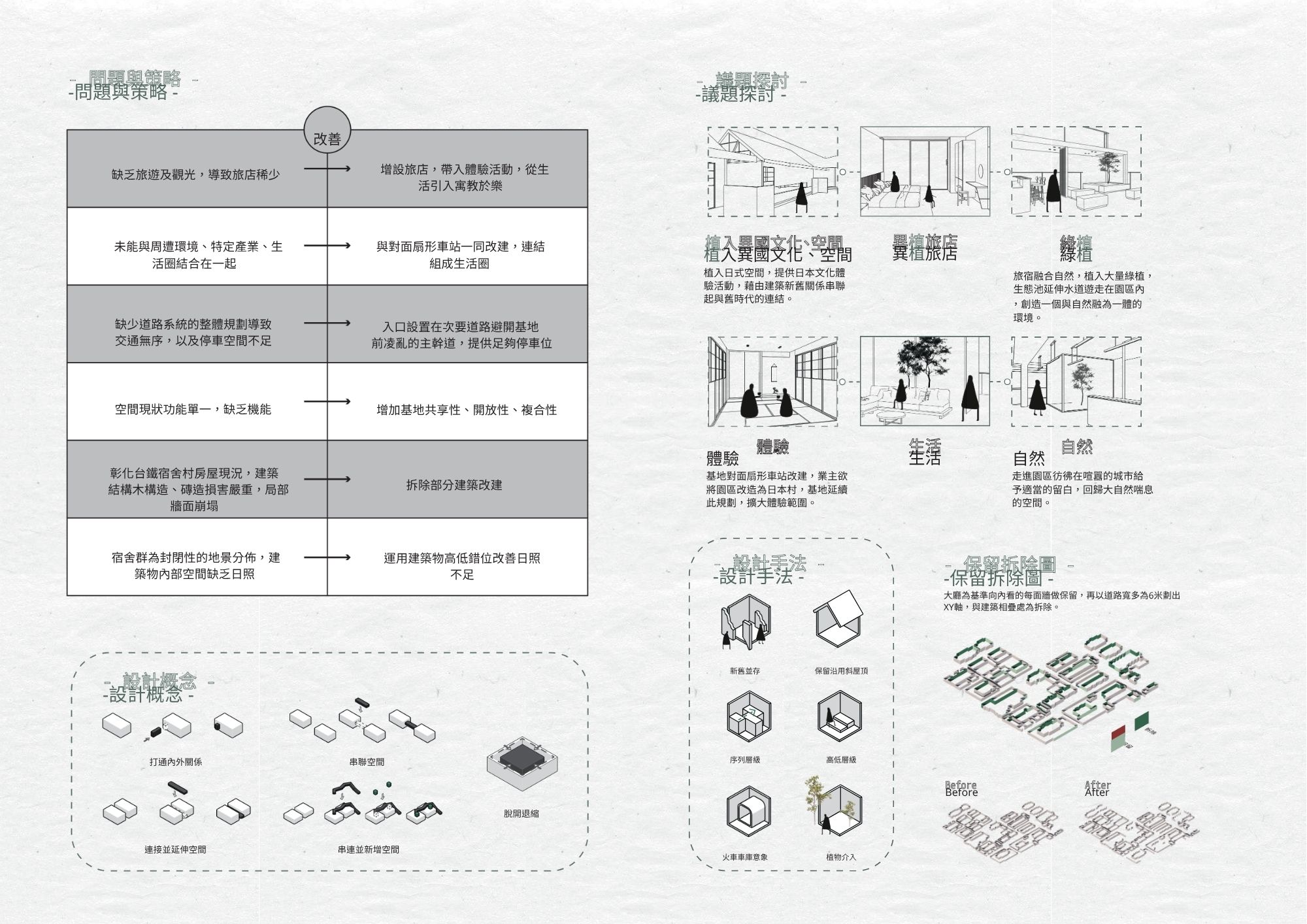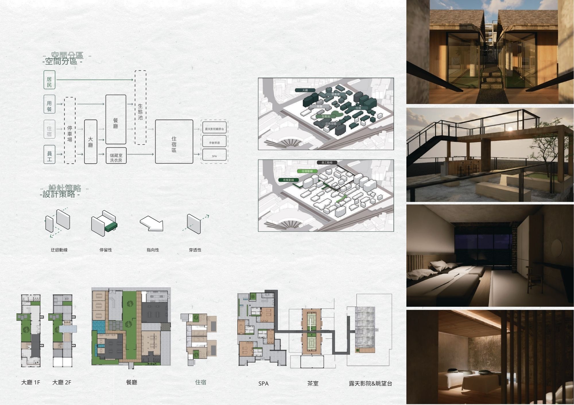異植旅店的植有兩個意思;植入日式空間,提供日本文化體驗活動。旅宿融合自然,植入大量綠植,生態池延伸水道遊走在園區內,創造一個與自然融為一體的環境。
