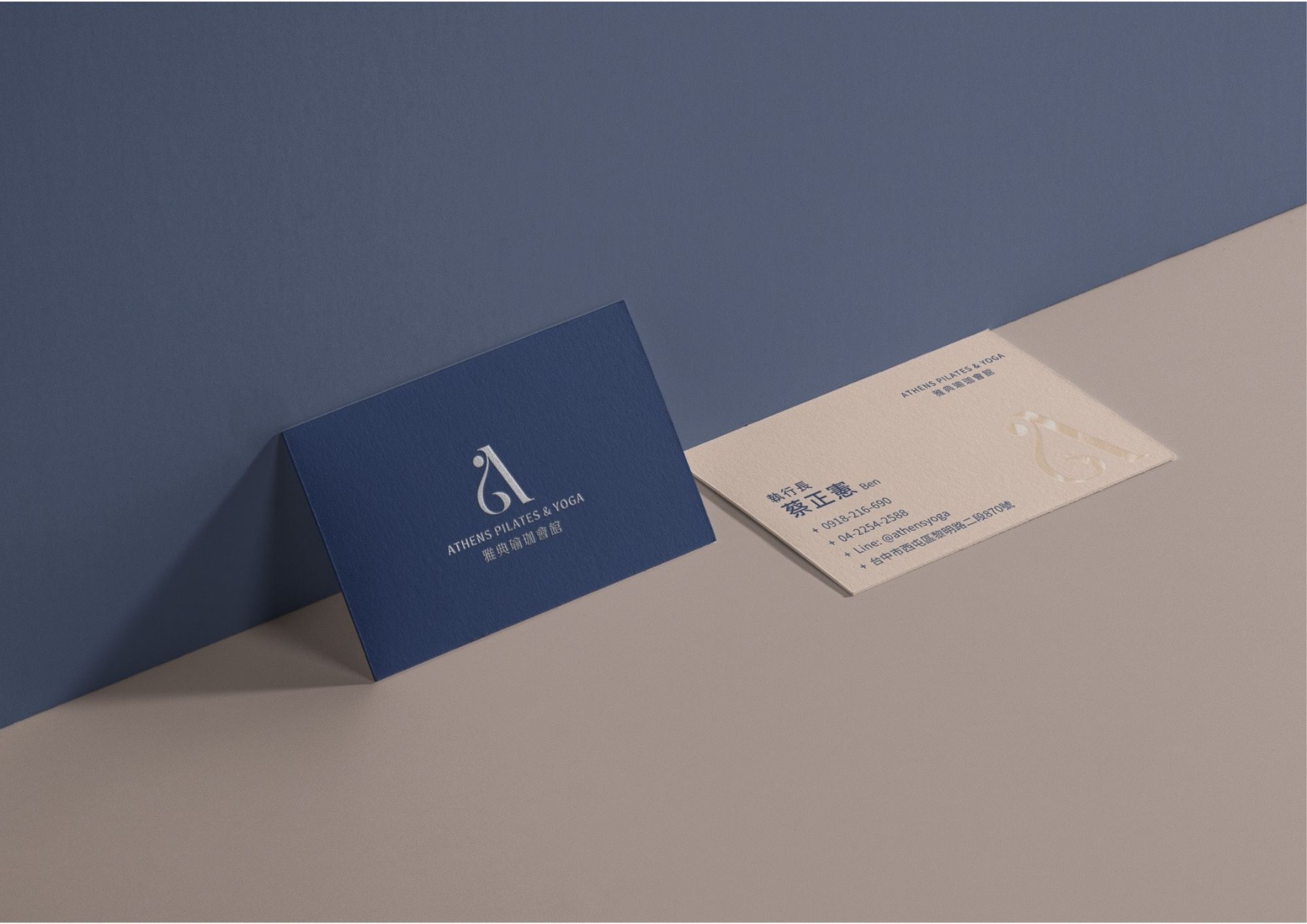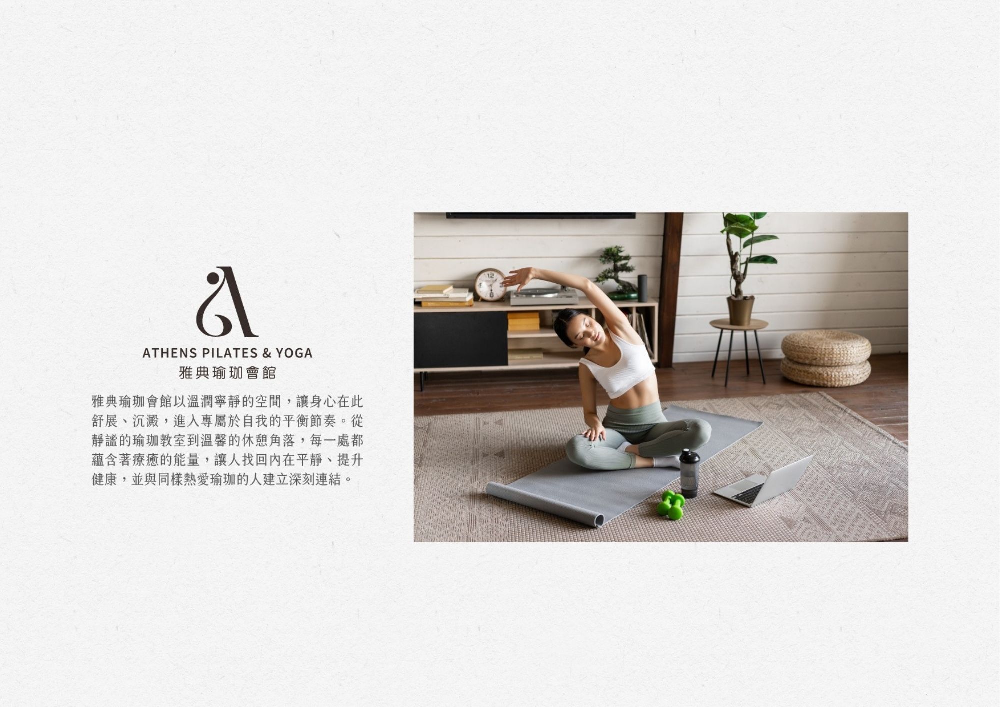 整體視覺識別系統以「專注、平衡、優雅」為核心精神,不僅傳遞出瑜珈練習中的內在狀態,也在視覺設計中創造出易於辨識、充滿靈性美感的品牌語言。使Logo不只是符號,而是承載品牌價值與精神意涵的象徵,使每位進入雅典瑜珈的練習者,都能從視覺識別中感受到穩定而細膩的陪伴。