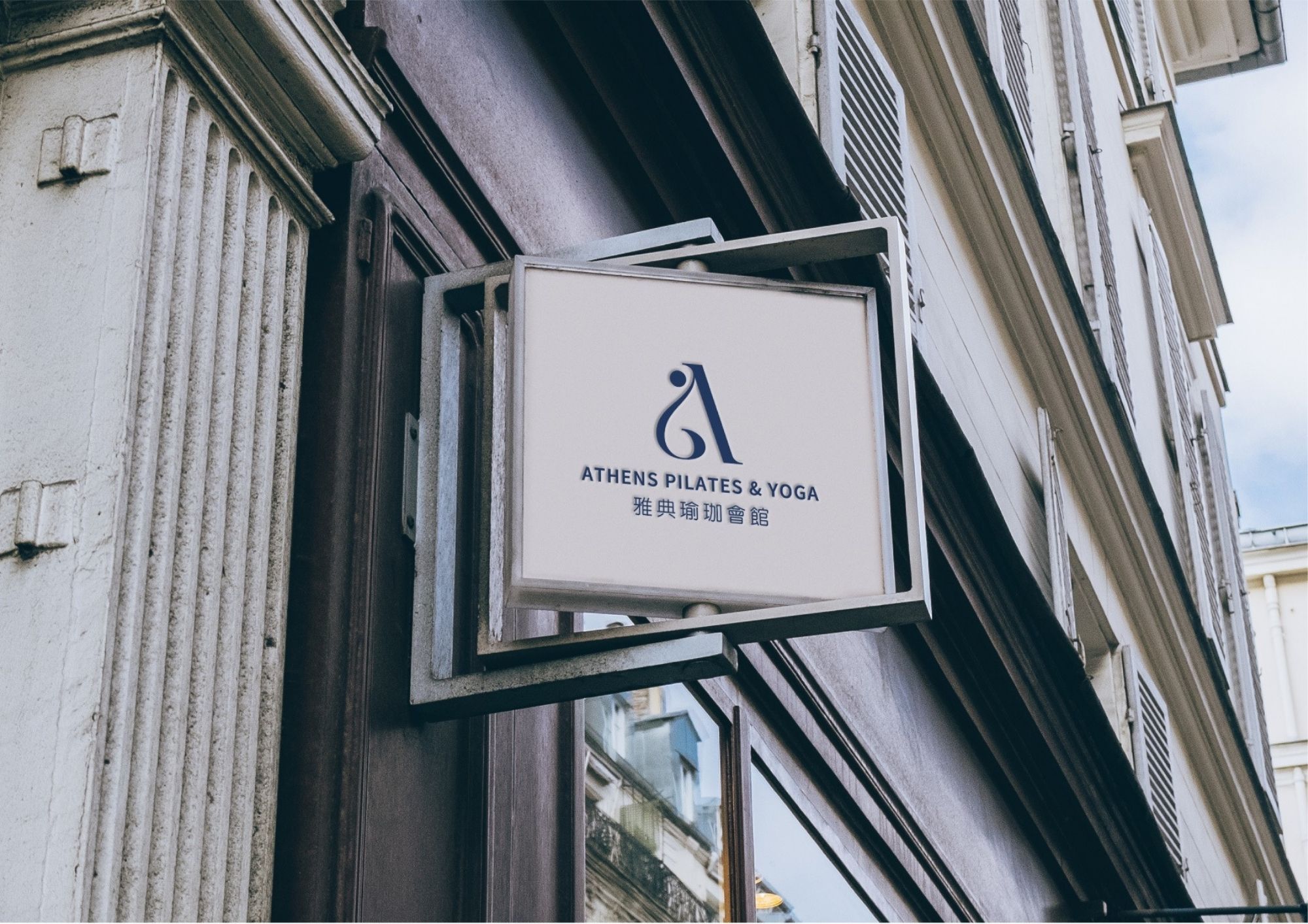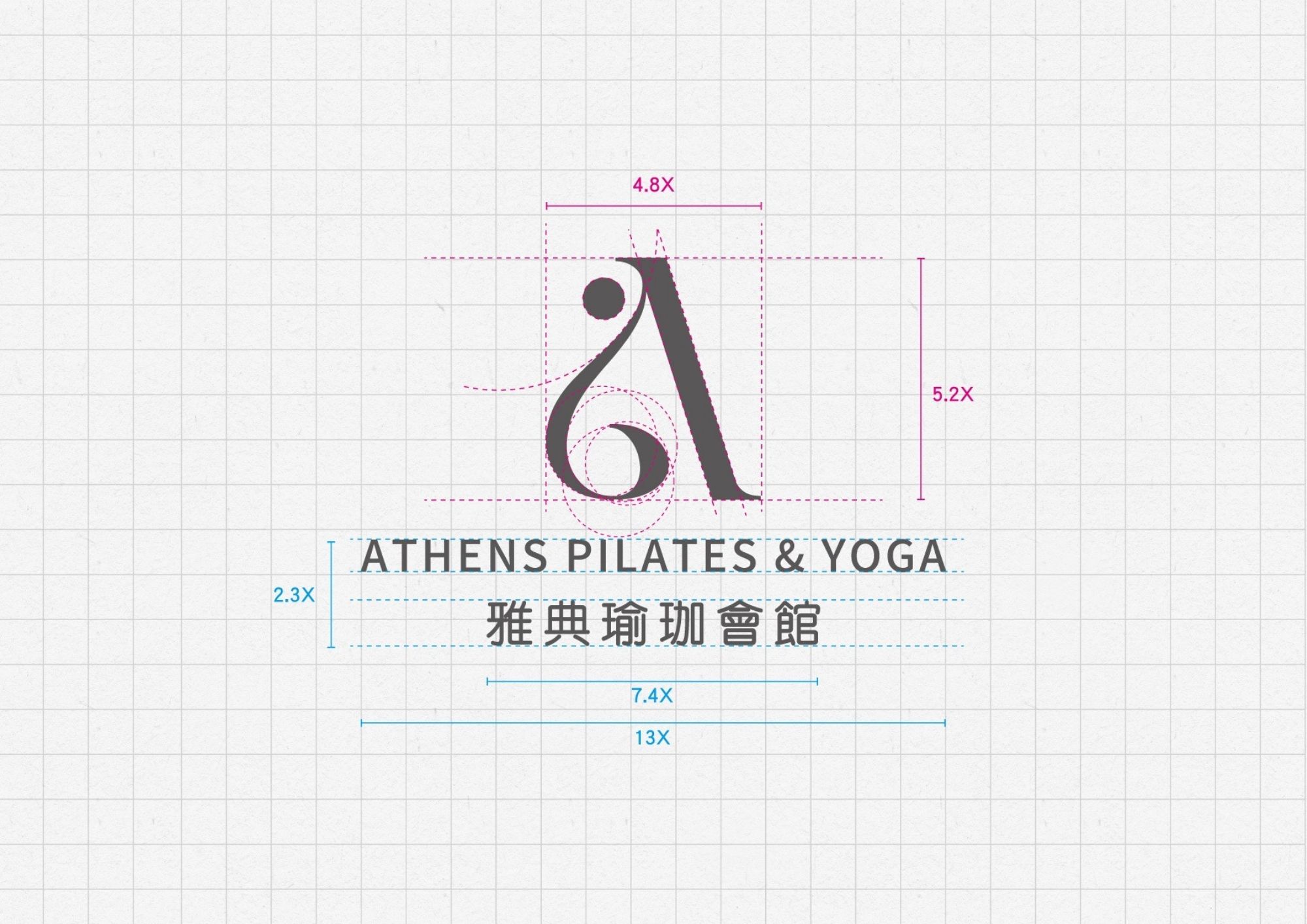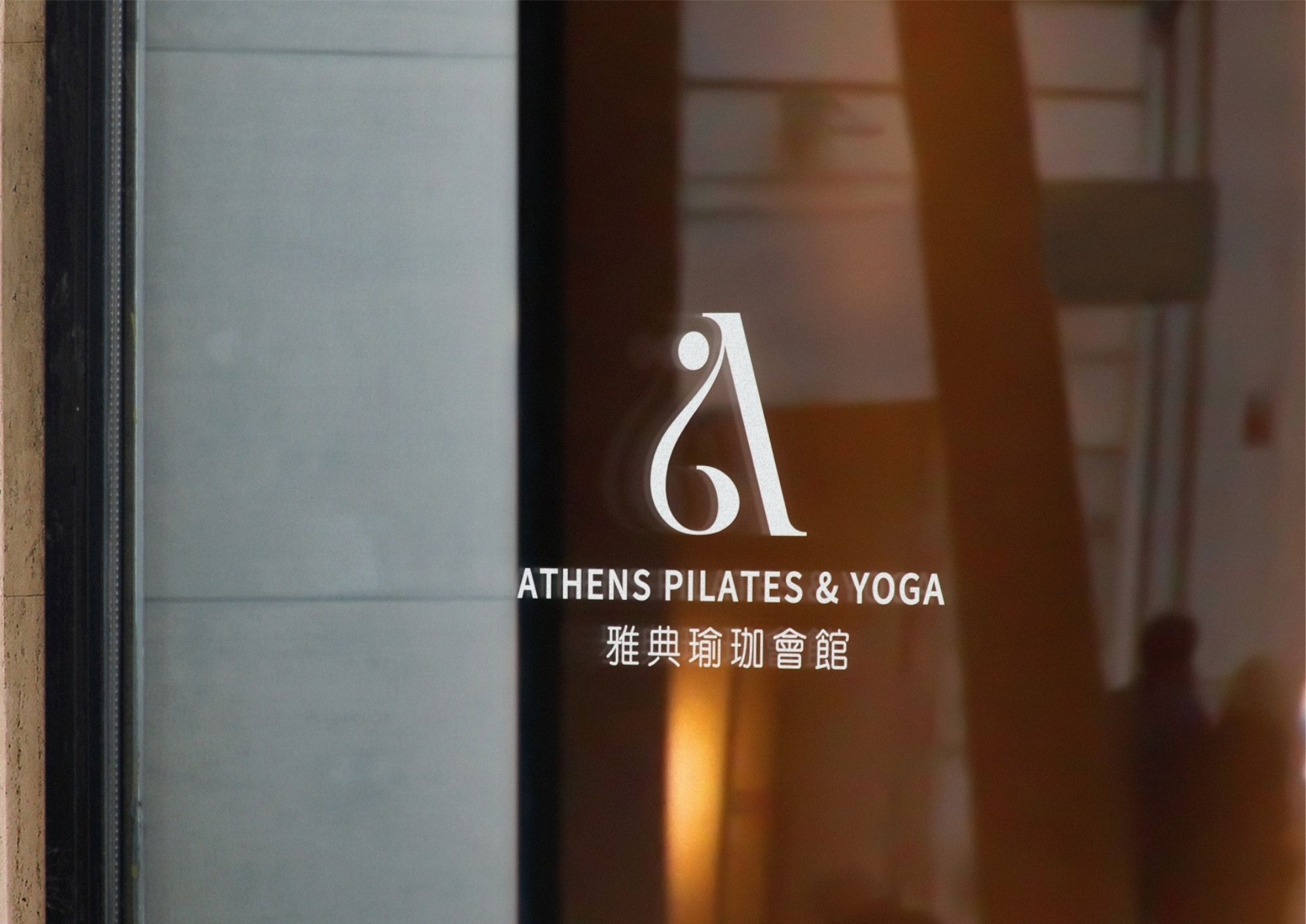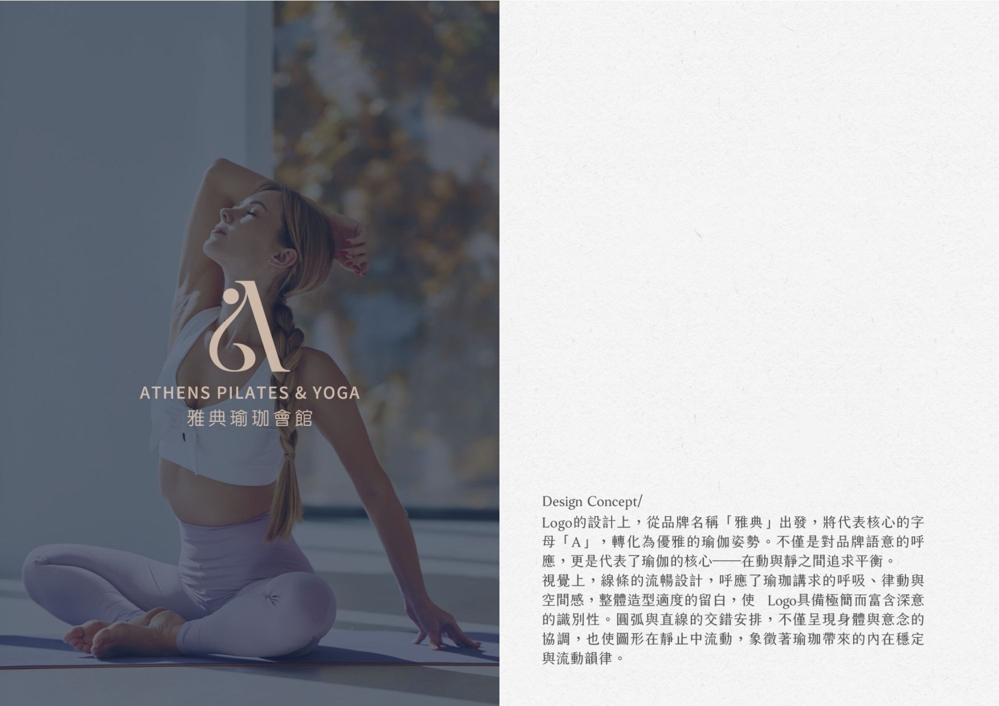 Logo的設計上,從品牌名稱「雅典」出發,將代表核心的字母「A」,轉化為優雅的瑜伽姿勢。不僅是對品牌語意的呼應,更是代表了瑜伽的核心──在動與靜之間追求平衡。