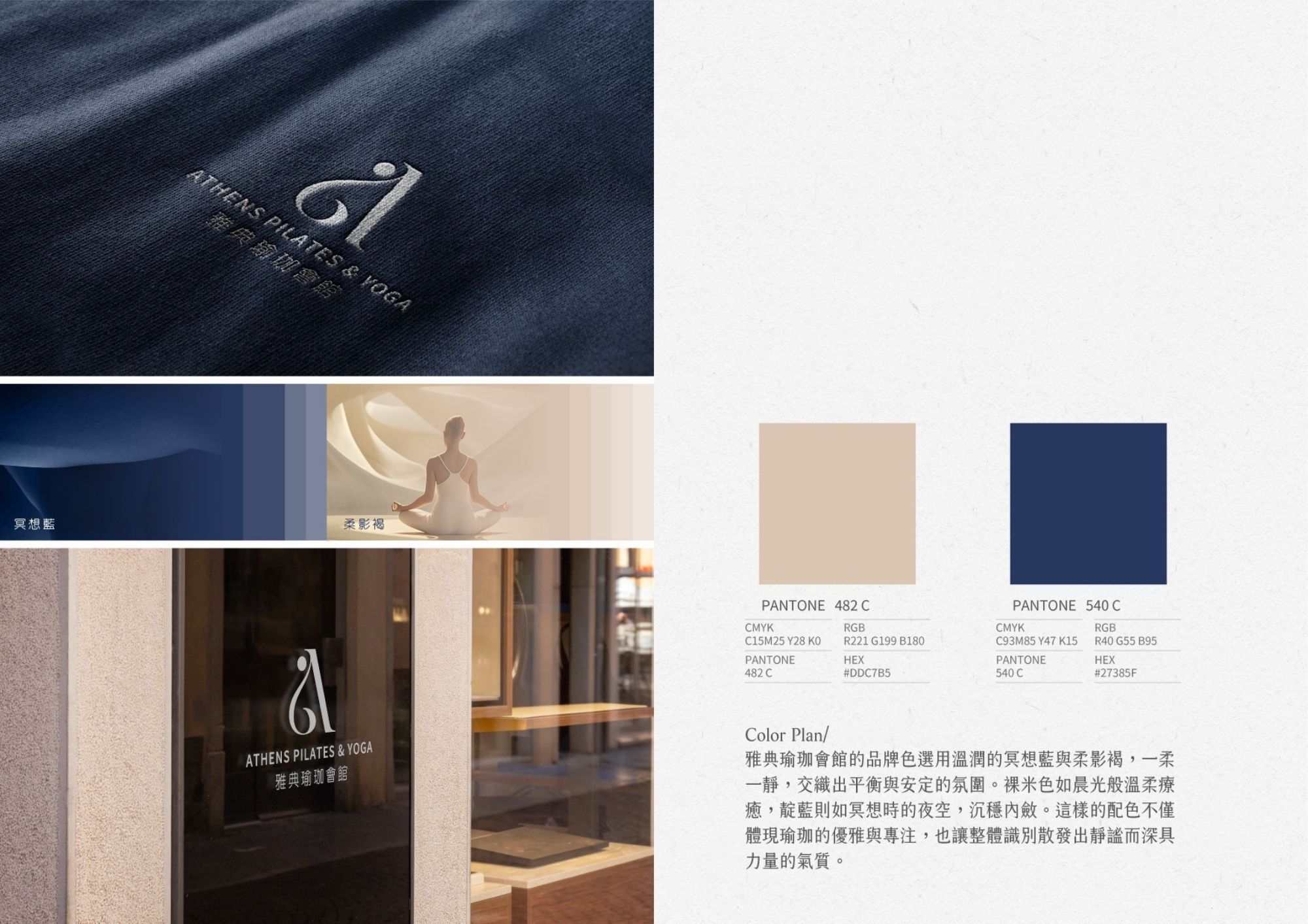 色彩應用上,選用 PANTONE 540 C 冥想藍與 PANTONE 482 C 柔影褐作為主色搭配。冥想藍代表冥想中的沉靜、智慧與深度,宛如夜晚靜謐的天空;而柔影褐則展現溫柔、包容與療癒的質感,如清晨第一道柔光,溫暖而安定。這組配色延伸了瑜珈「陰陽平衡」的核心理念,並建構出品牌獨有的情緒語境:柔中帶穩,靜中含光。