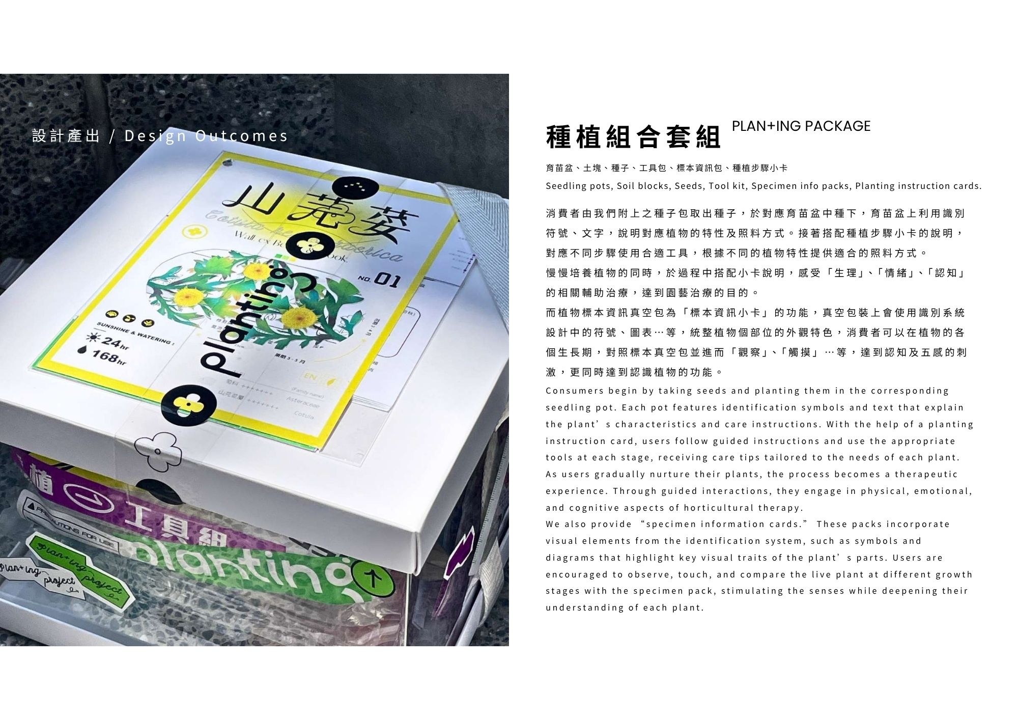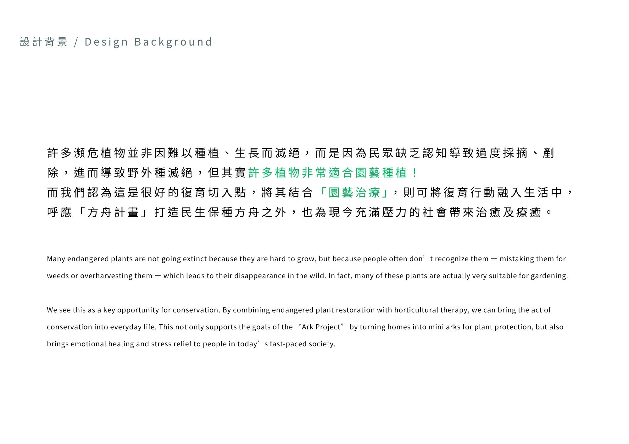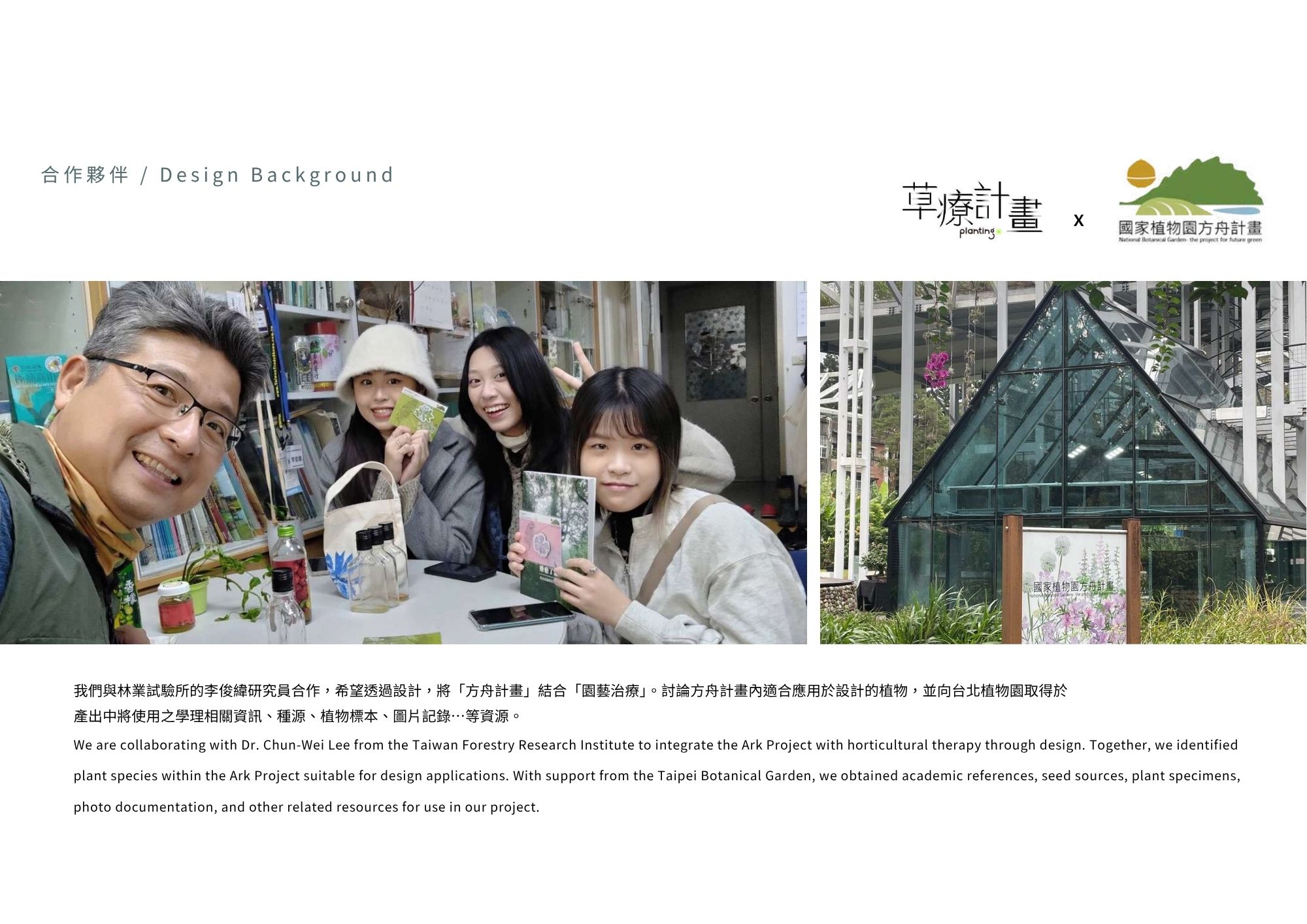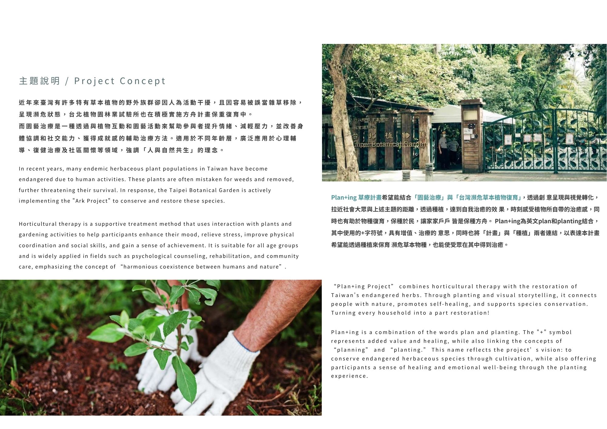 Plan+ing 草療計畫結合瀕危植物復育與園藝治療,透過設計讓民眾在種植中感受療癒力量,實踐日常保種,讓每戶成為「微型方舟」。由 plan 與 planting 組成,「+」象徵療癒與增值,傳達透過種植延續復育,也滋養人心。