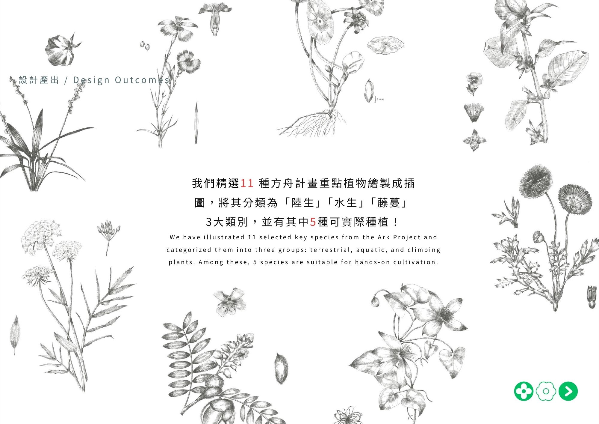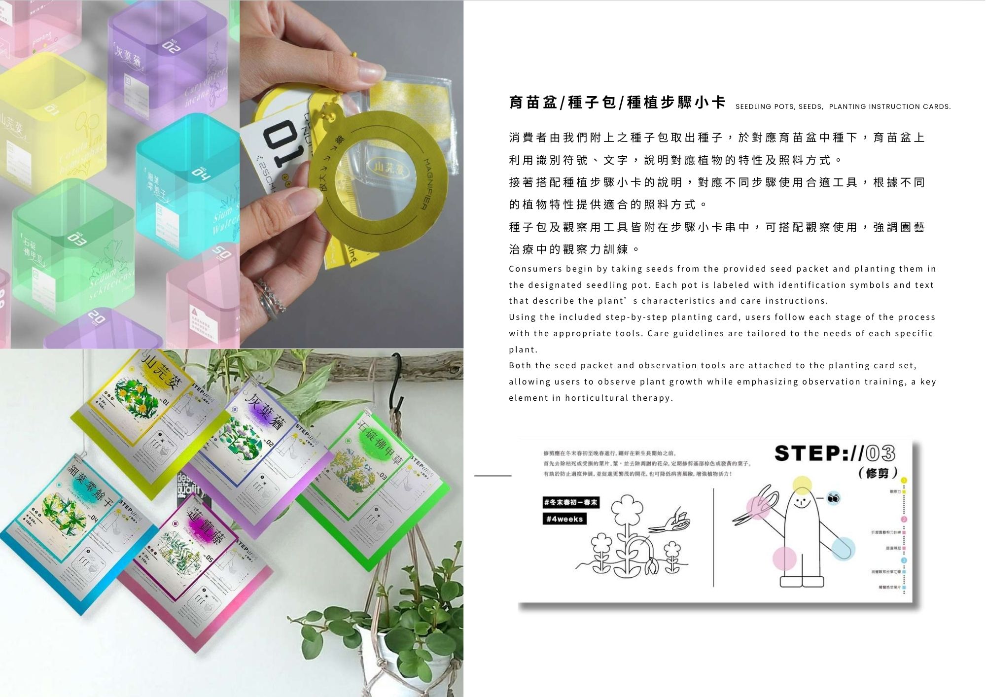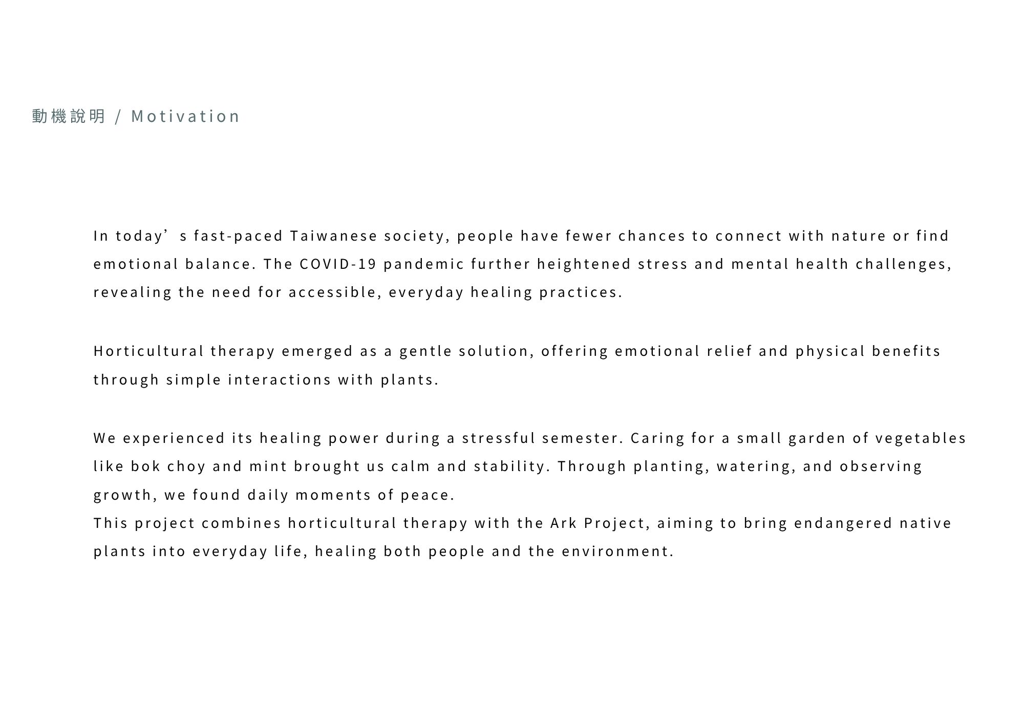 Plan+ing 草療計畫結合瀕危植物復育與園藝治療,透過設計讓民眾在種植中感受療癒力量,實踐日常保種,讓每戶成為「微型方舟」。由 plan 與 planting 組成,「+」象徵療癒與增值,傳達透過種植延續復育,也滋養人心。