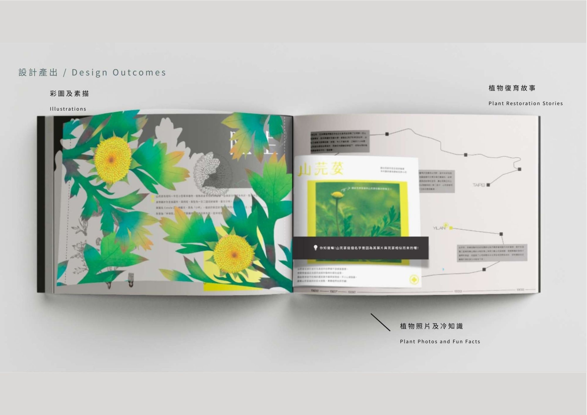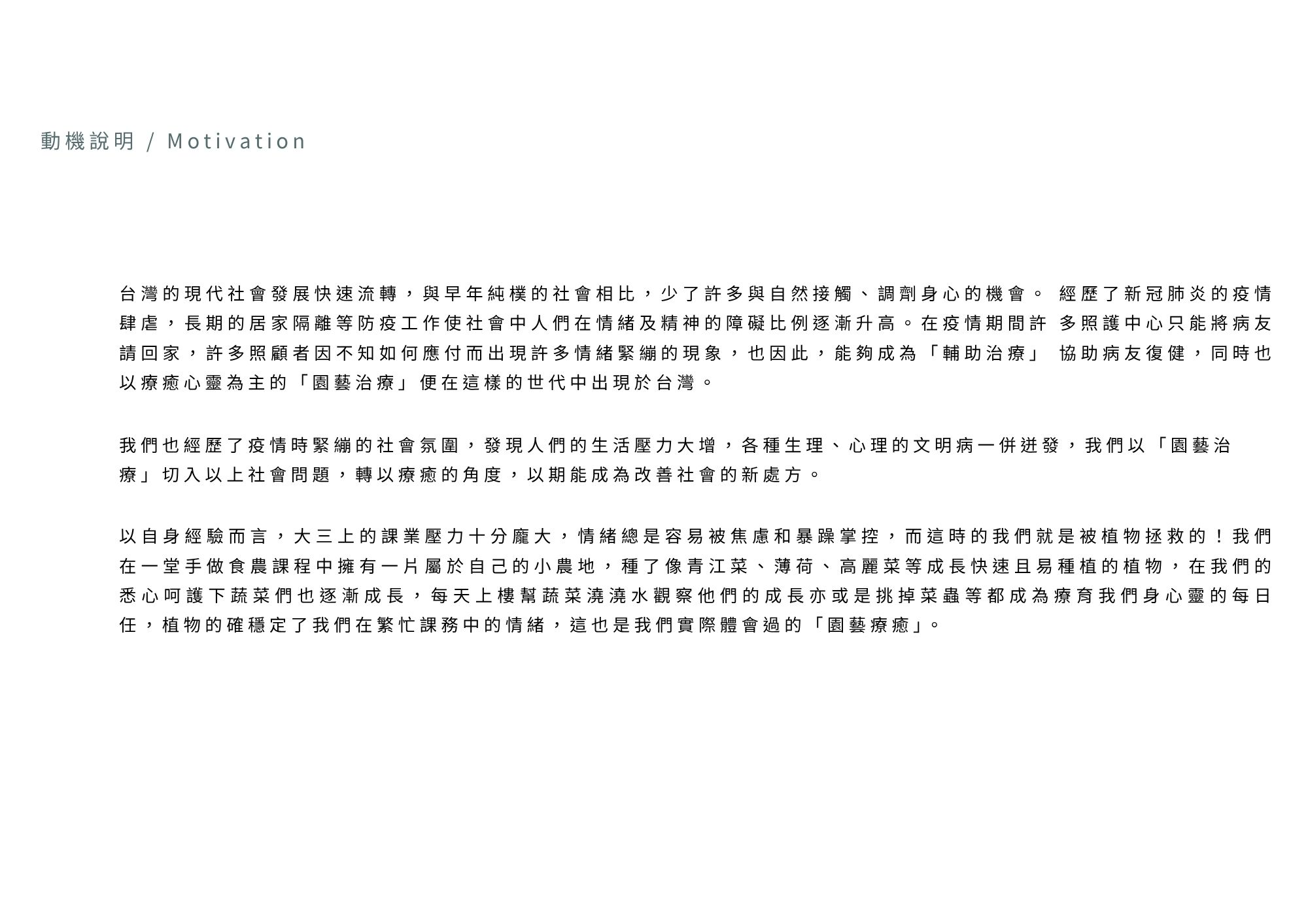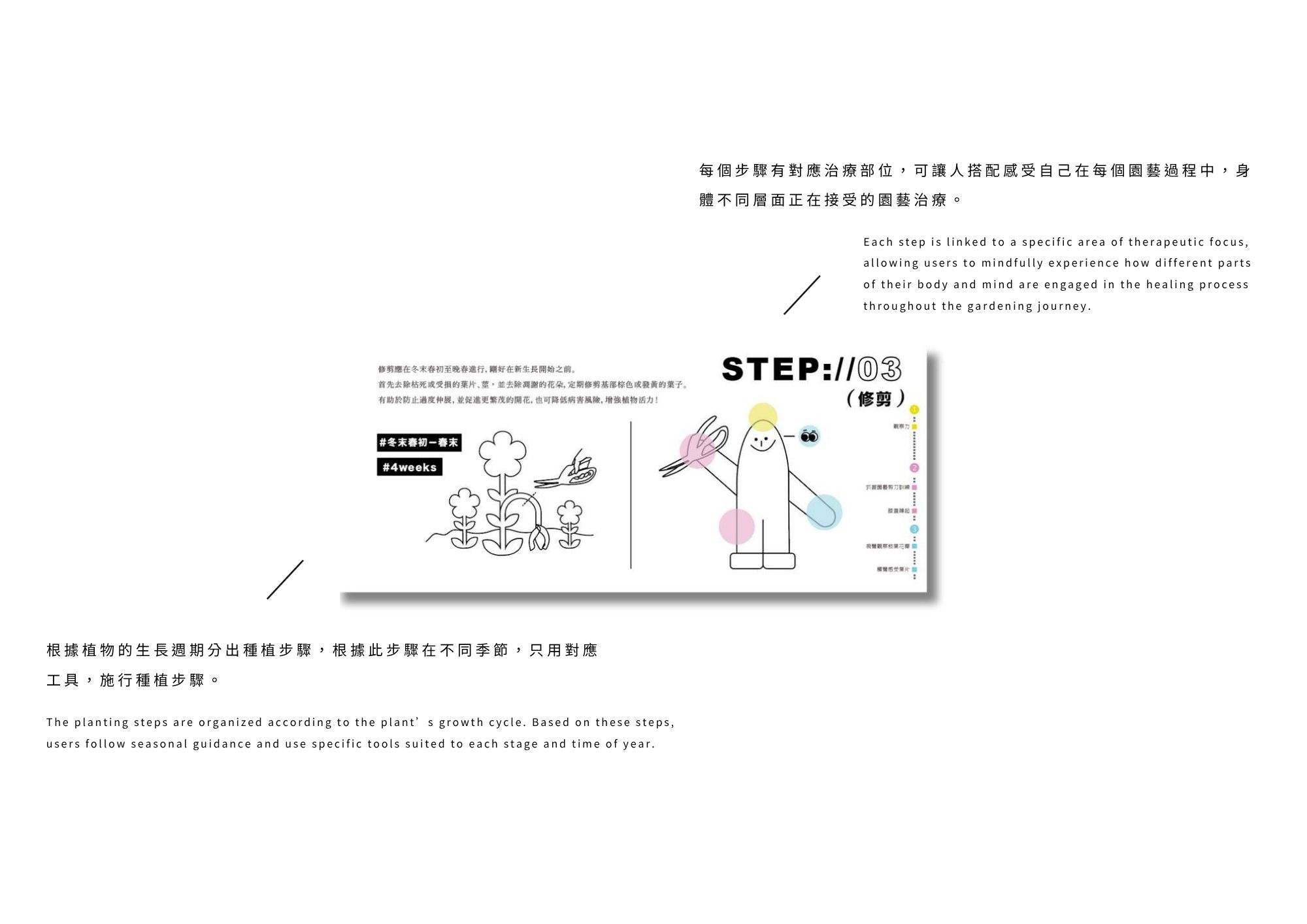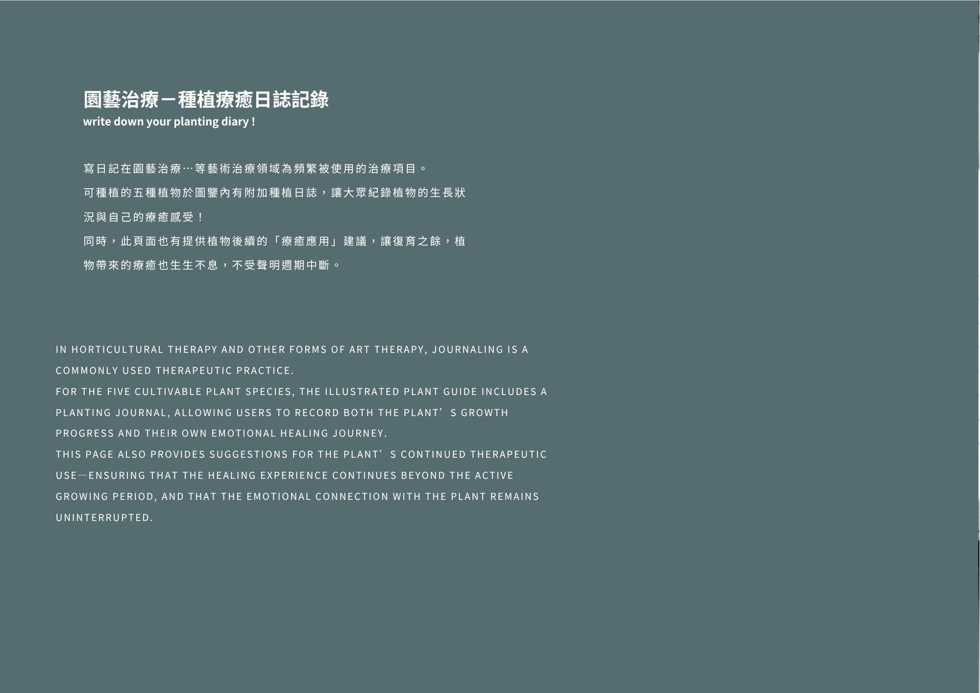 Plan+ing 草療計畫結合瀕危植物復育與園藝治療,透過設計讓民眾在種植中感受療癒力量,實踐日常保種,讓每戶成為「微型方舟」。由 plan 與 planting 組成,「+」象徵療癒與增值,傳達透過種植延續復育,也滋養人心。