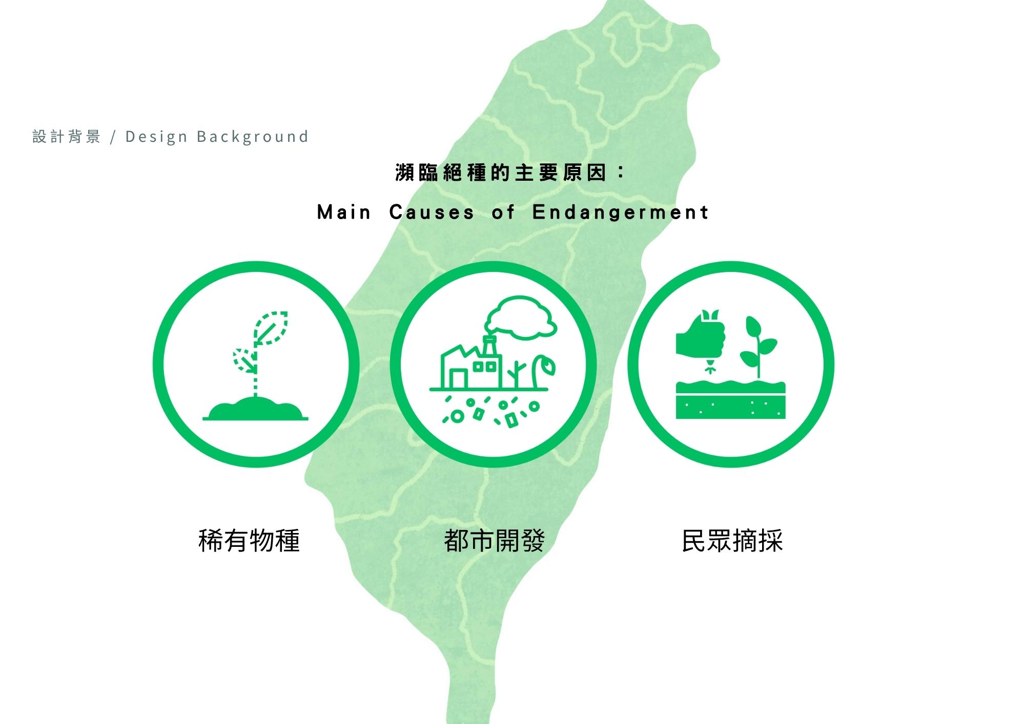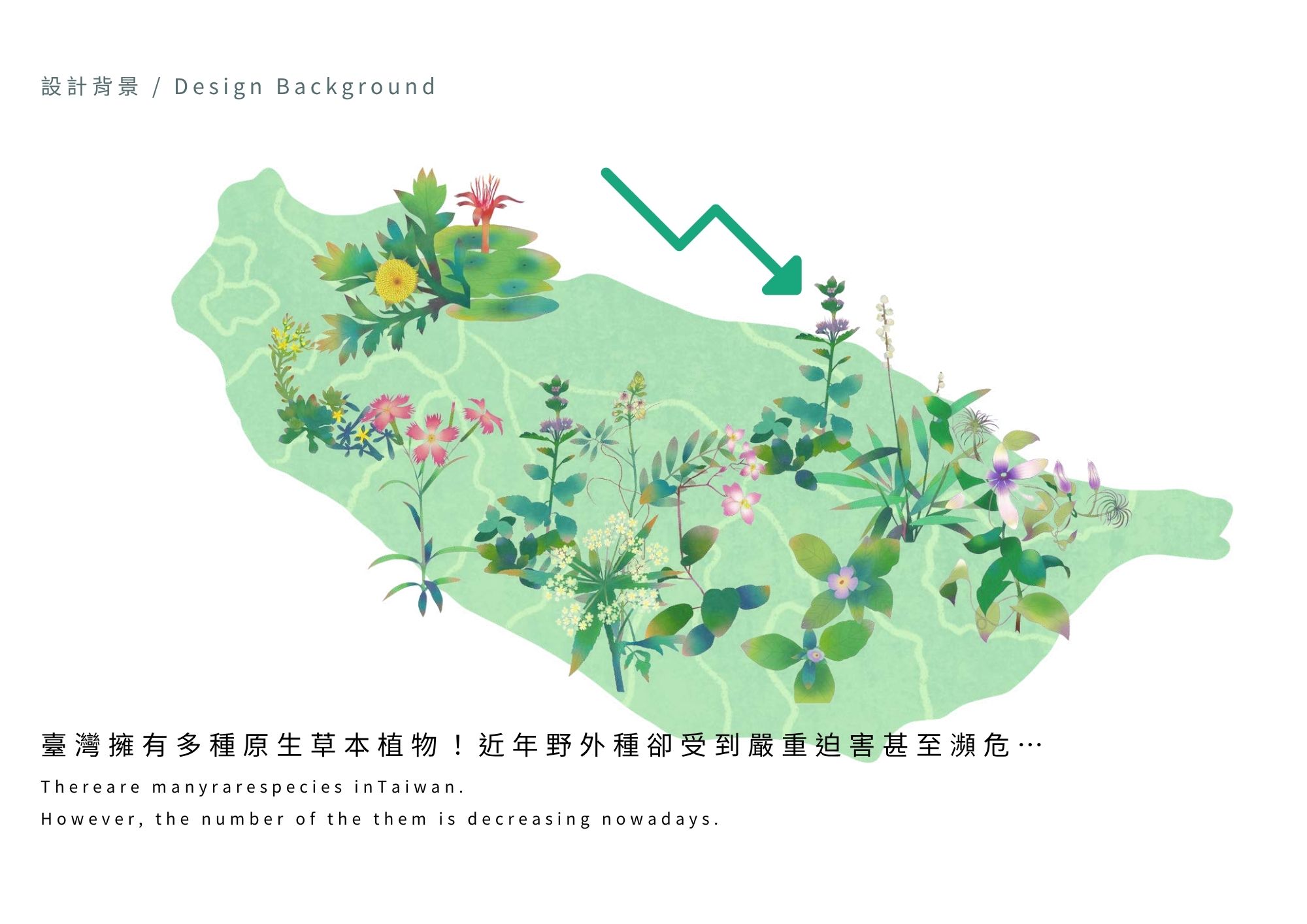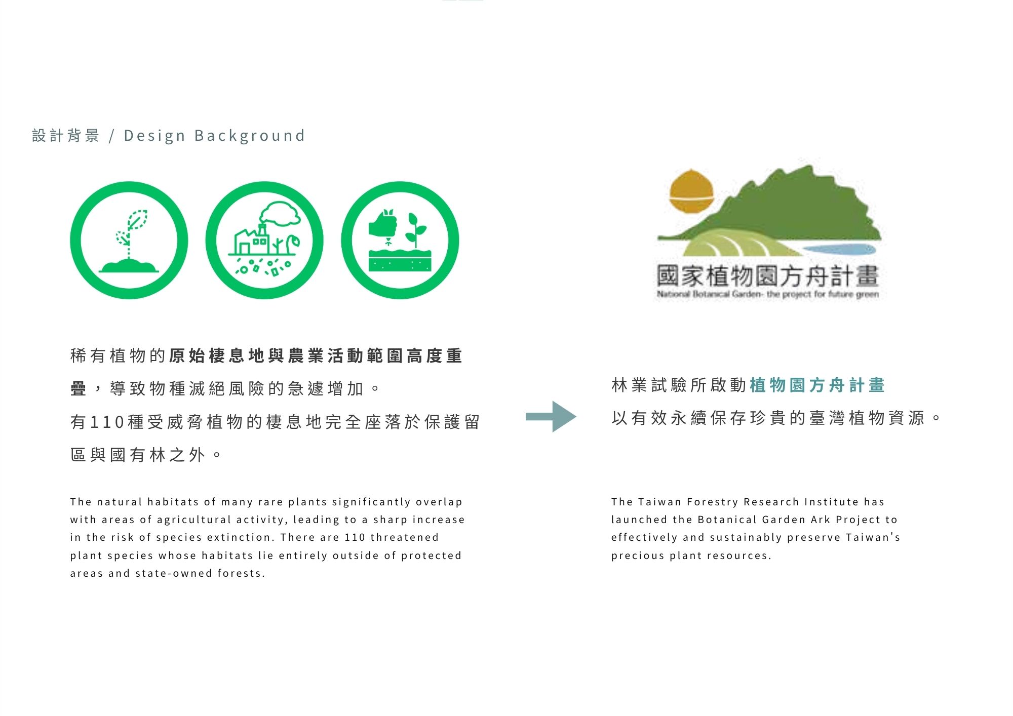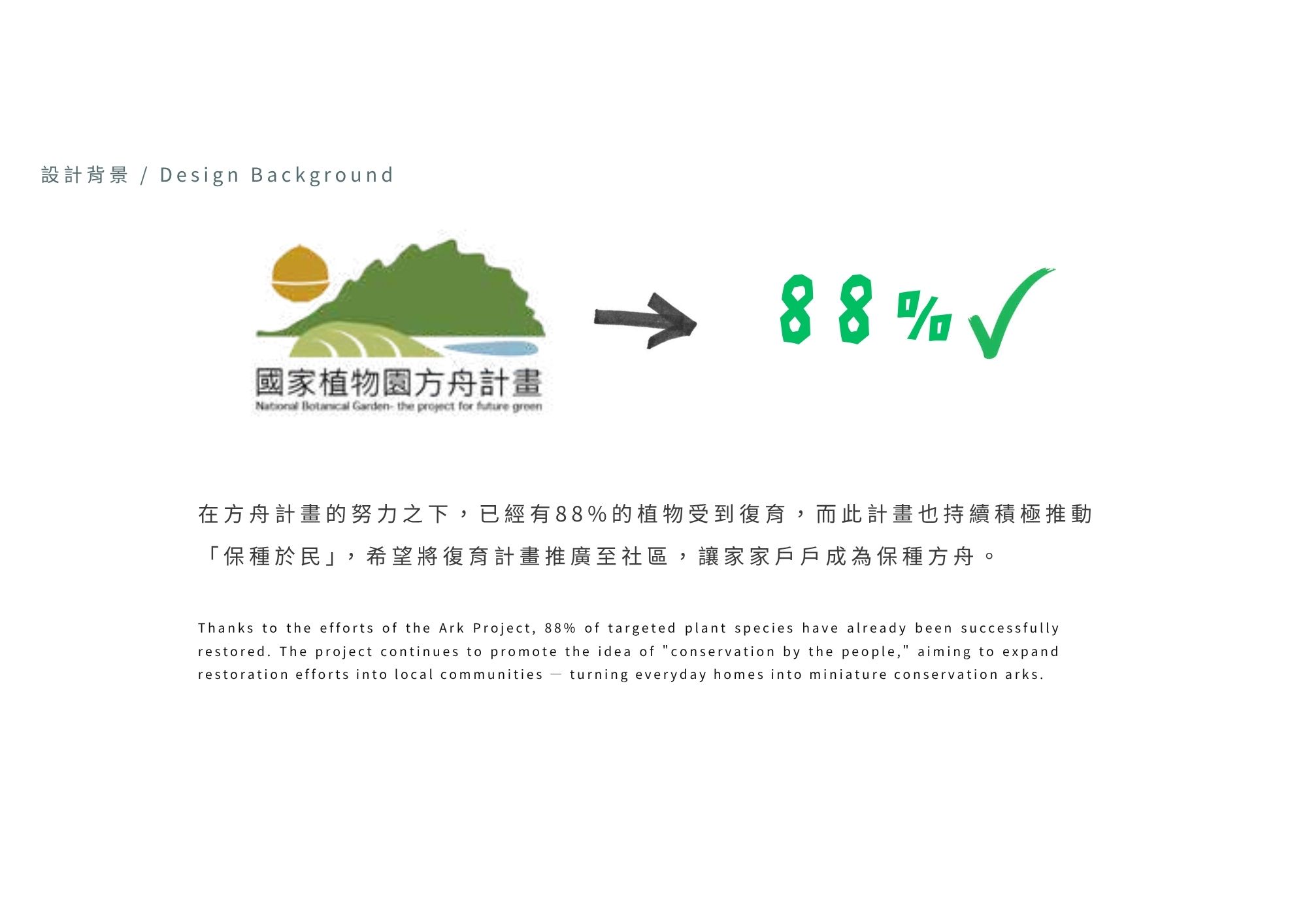 台灣許多特有草本植物因人為干擾與誤認為雜草而遭移除,野外族群面臨瀕危。台北植物園與林業試驗所推動「方舟計畫」,進行保育與復育,並期望將保種延伸至社區。