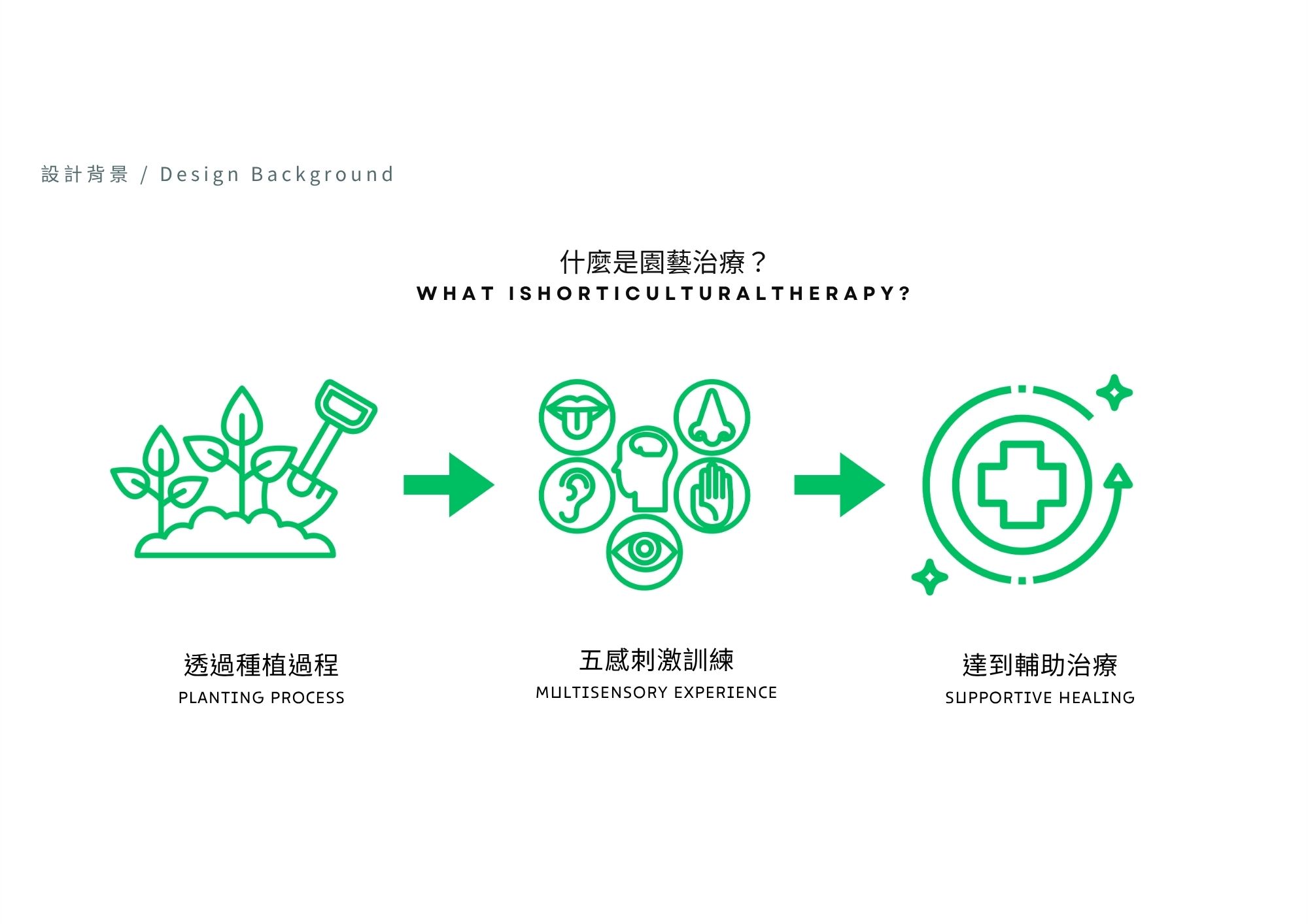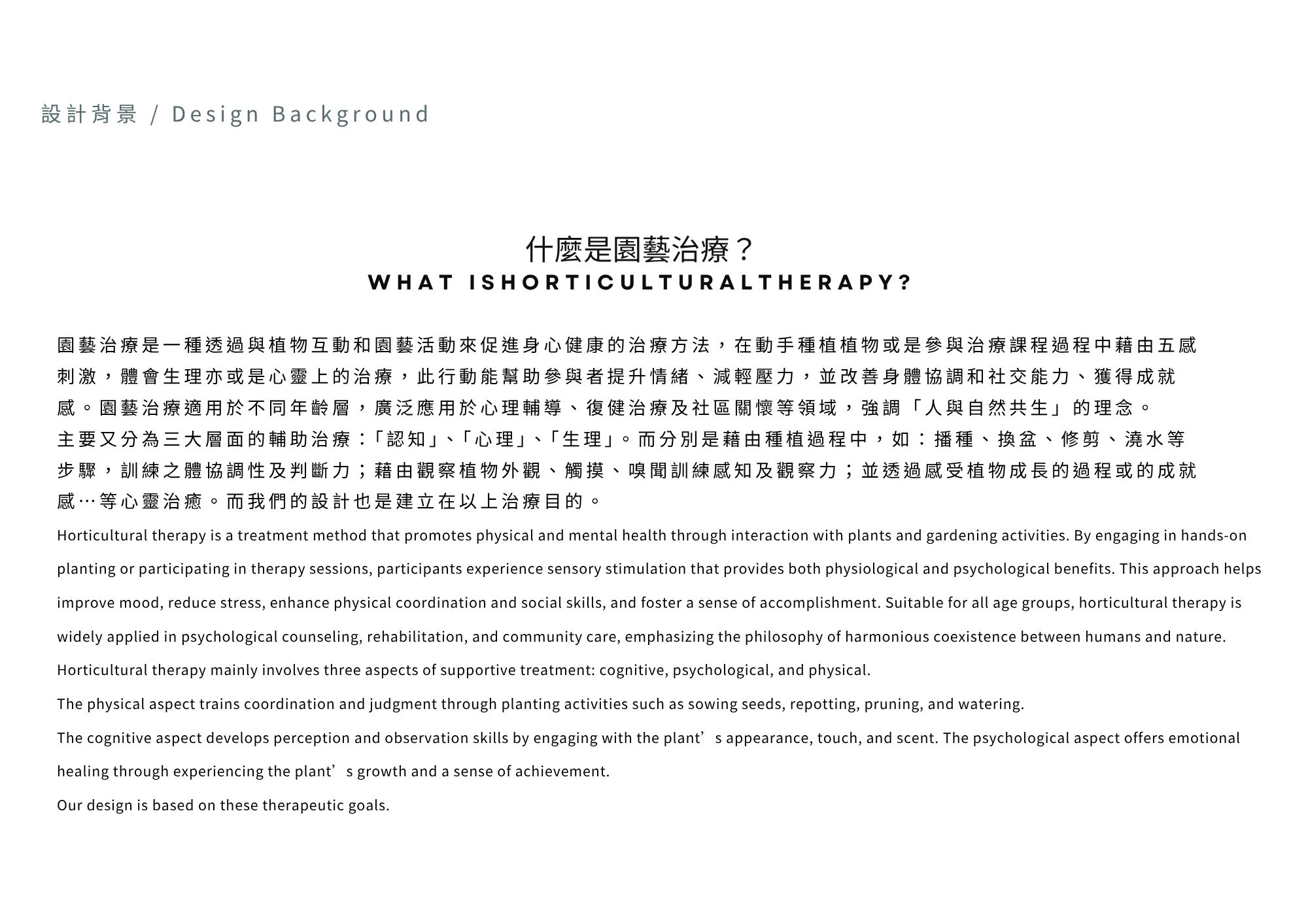 園藝治療則透過與植物互動,幫助紓壓、穩定情緒,增進身心協調與社交能力,廣泛應用於輔療與社區照護。