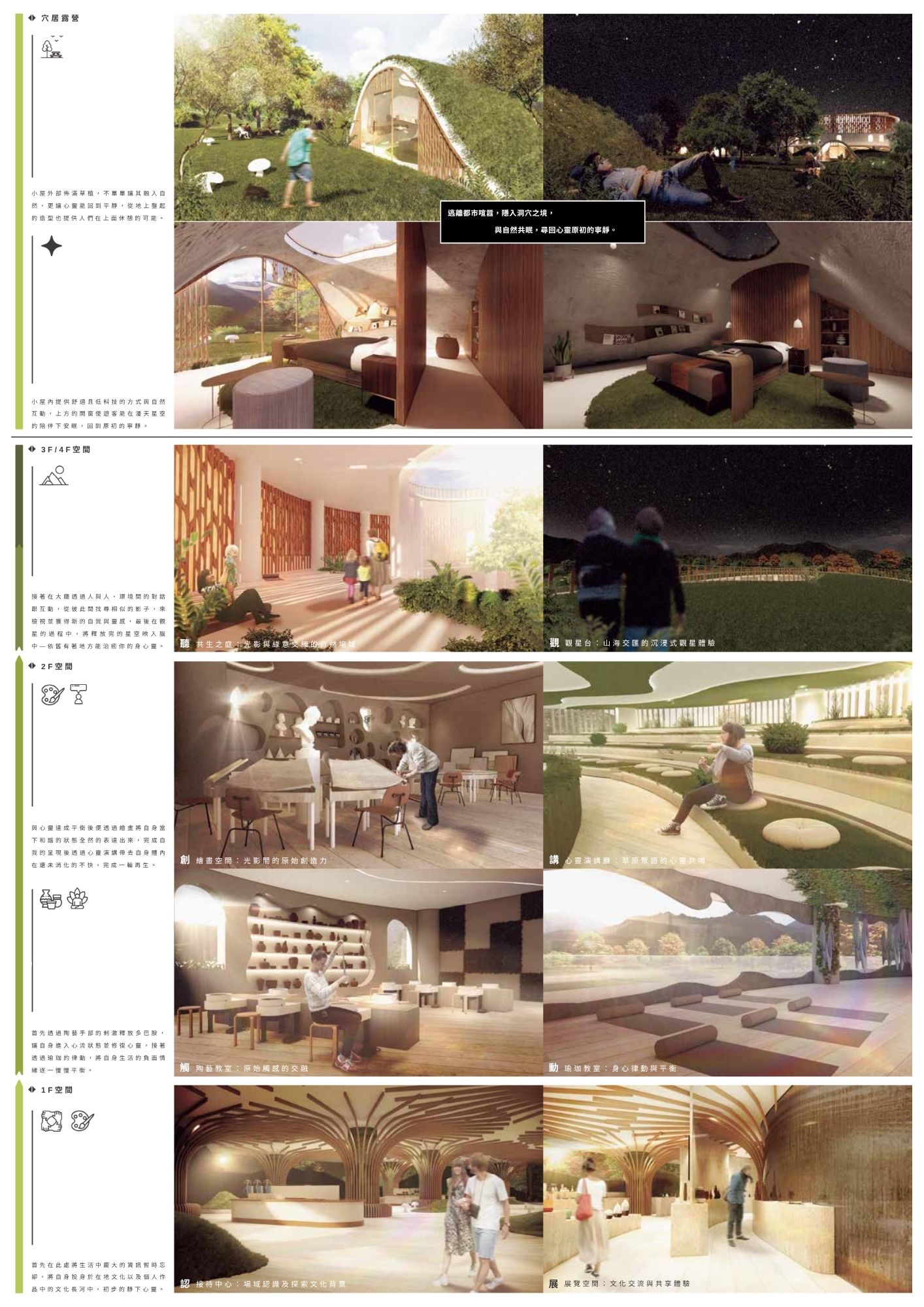 透過低科技共生,將舊能源展示館轉型為自然療癒場域,依據原始人生活型態進行分析探討,,創造沉浸式五感體驗,透過環境再生與低干預建築設計,營造可持續的身心棲息地。